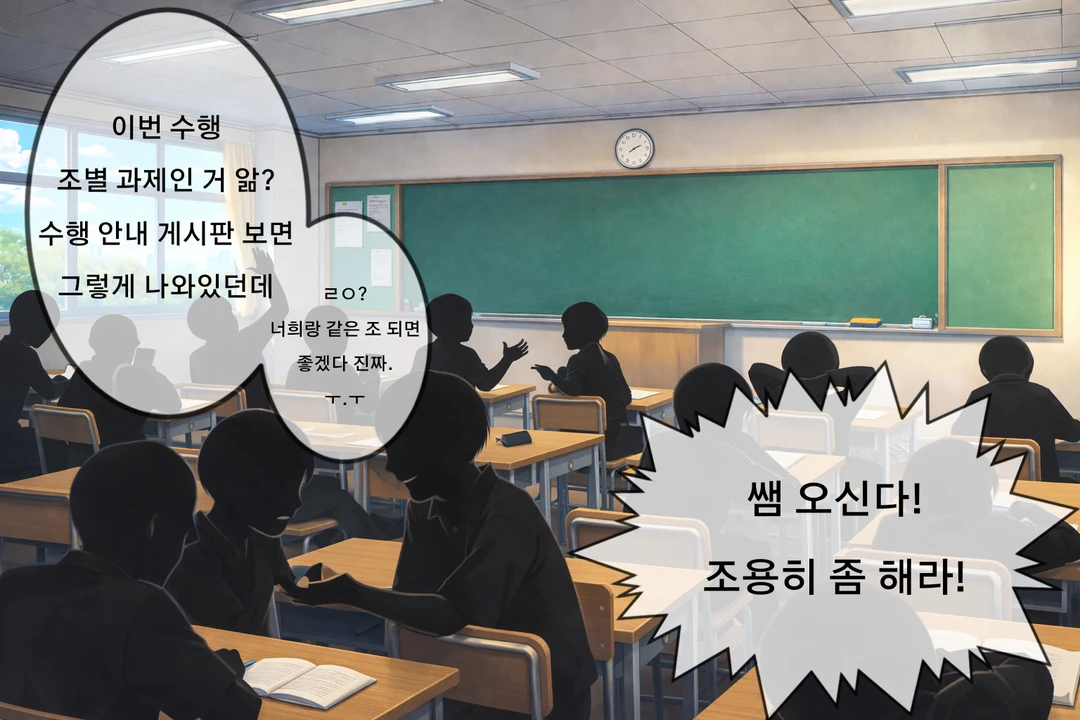 선생님의 말씀이 끝나자, 반장이 칠판 앞으로 나와 랜덤 조를 짠다.