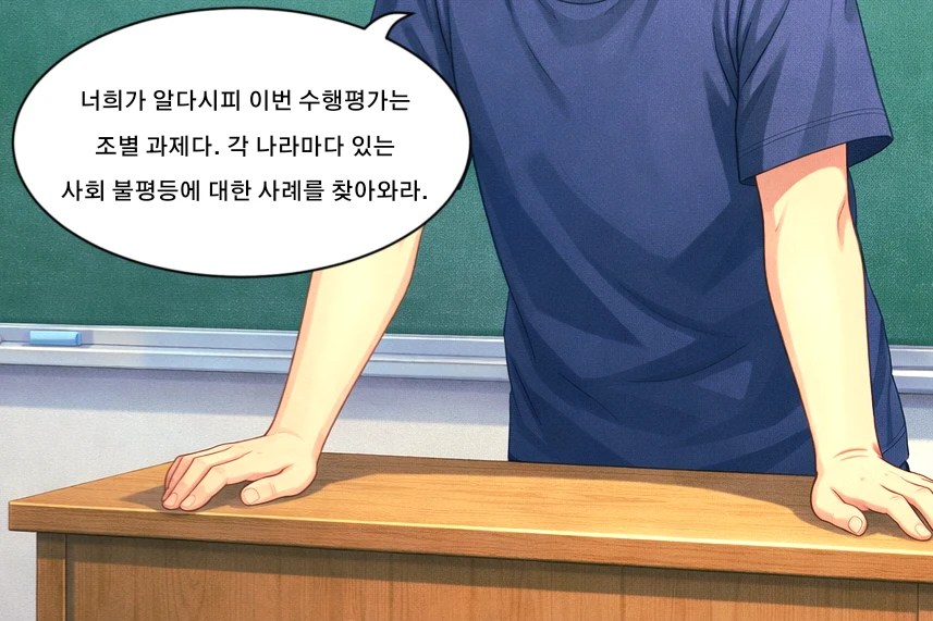 엉망진창인 분위기를 정리한 후, 선생님께서 정해주신 자리에 앉는다. 그 후, 선생님의 설명을 듣고, 다른 조와 내용이 겹치지 않기 위해 각 모둠마다 나라를 정한다. 우리 조는 "한국"으로 정했다. 이제 슬슬 역할을 정해야 하는데...