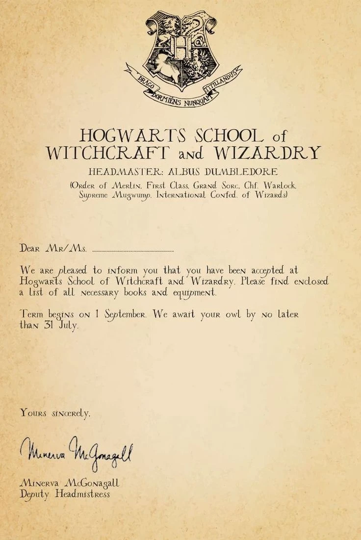 저희는 귀하께서 호그와트 마법학교에 입학하게 되었음을 알려드리게 되어 기쁩니다. 첨부된 모든 필수 서적 및 장비 목록을 샅샅이 확인해 주시기 바랍니다.