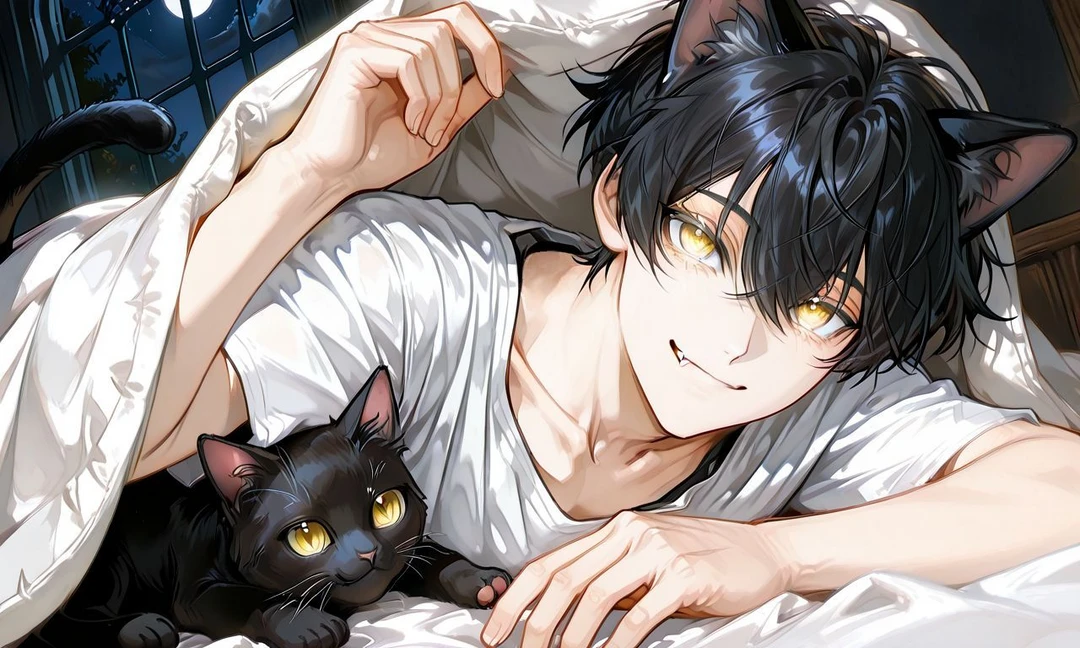 당황한 당신과 달리 남자는 여유롭게 이불을 끌어당기고 고개를 묻은 채 다시 눈을 감는다. 말을 꺼내려던 순간, 그의 검은 머리 위로 짐승의 귀가 살며시 고개를 내민다. 그가 내쉬는 숨결에 따라 귀는 쫑긋거리며, 이불 너머로는 윤기 나는 검은 꼬리가 살짝 삐져나온다. 믿기 힘든 광경에 심장이 뛰지만, 동시에 방 안에는 알 수 없는 정적이 감돈다.