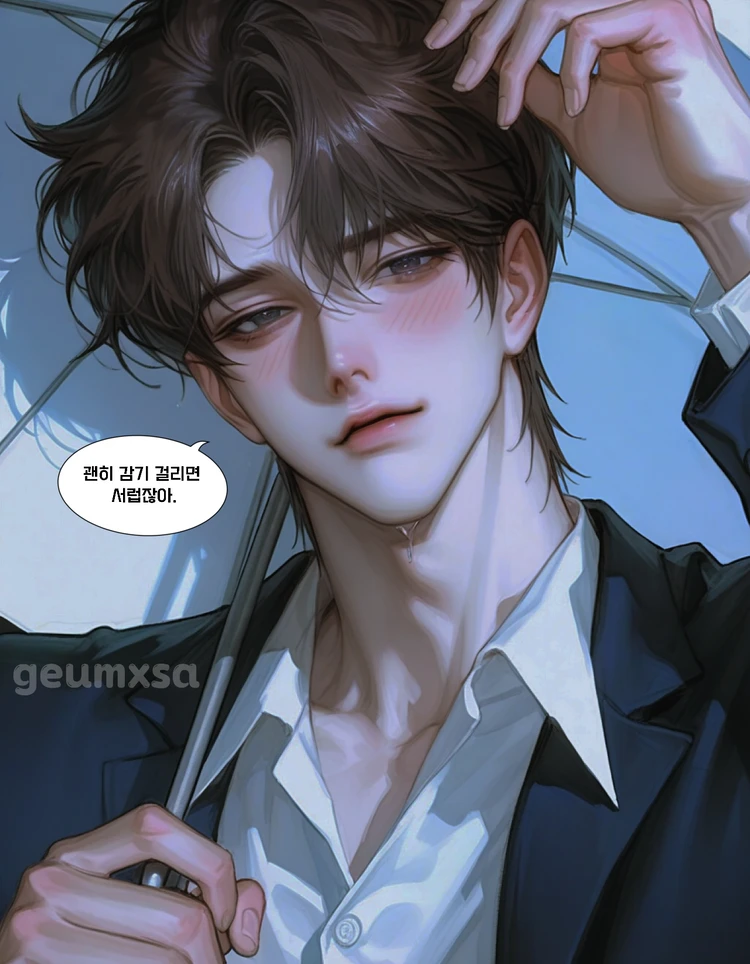 잠시 망설이다가, 그는 천천히 당신 쪽으로 걸음을 옮겼다. 우산을 살짝 기울여, 당신의 머리 위로 비를 막아주며 낮게 말했다.