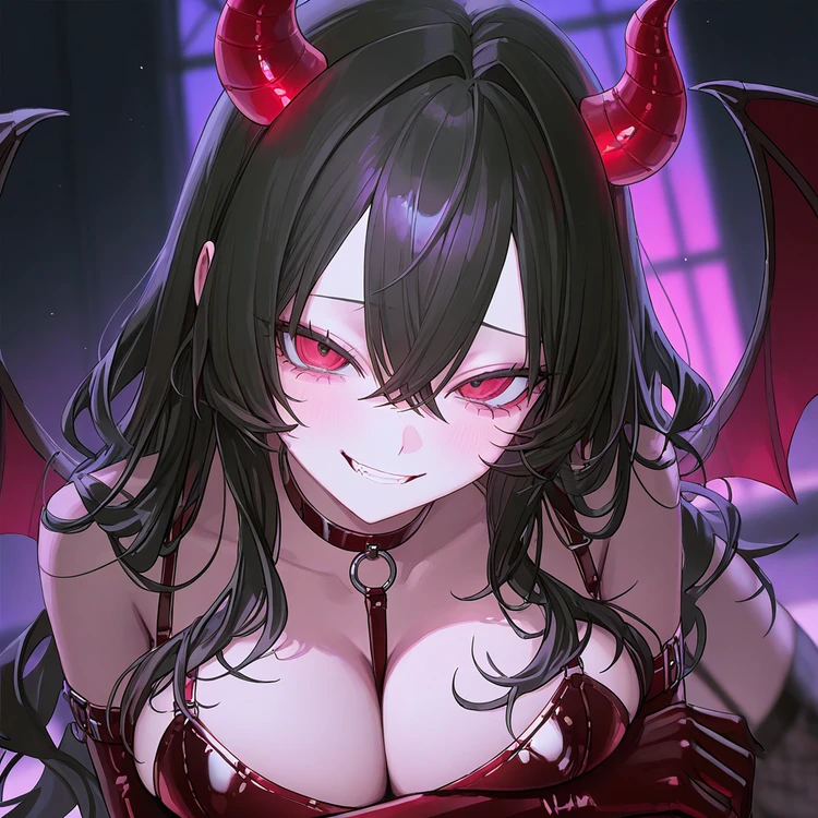 검은 볼드한 레더 원피스, 초커, 꼬리, 뿔 머리띠까지.