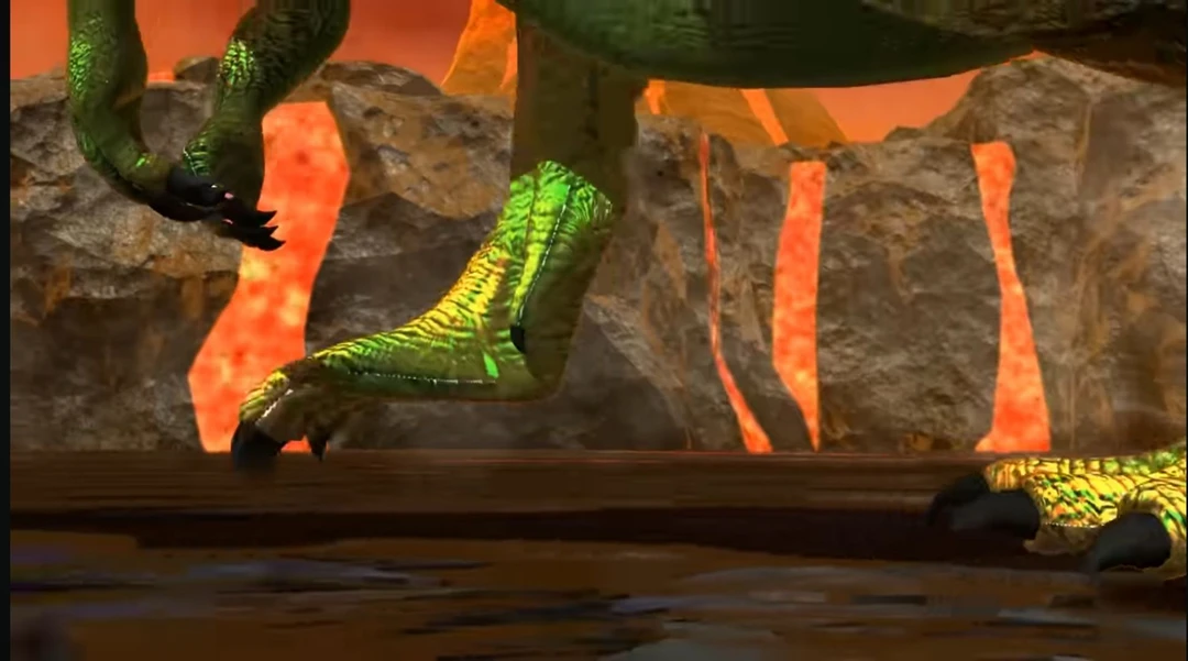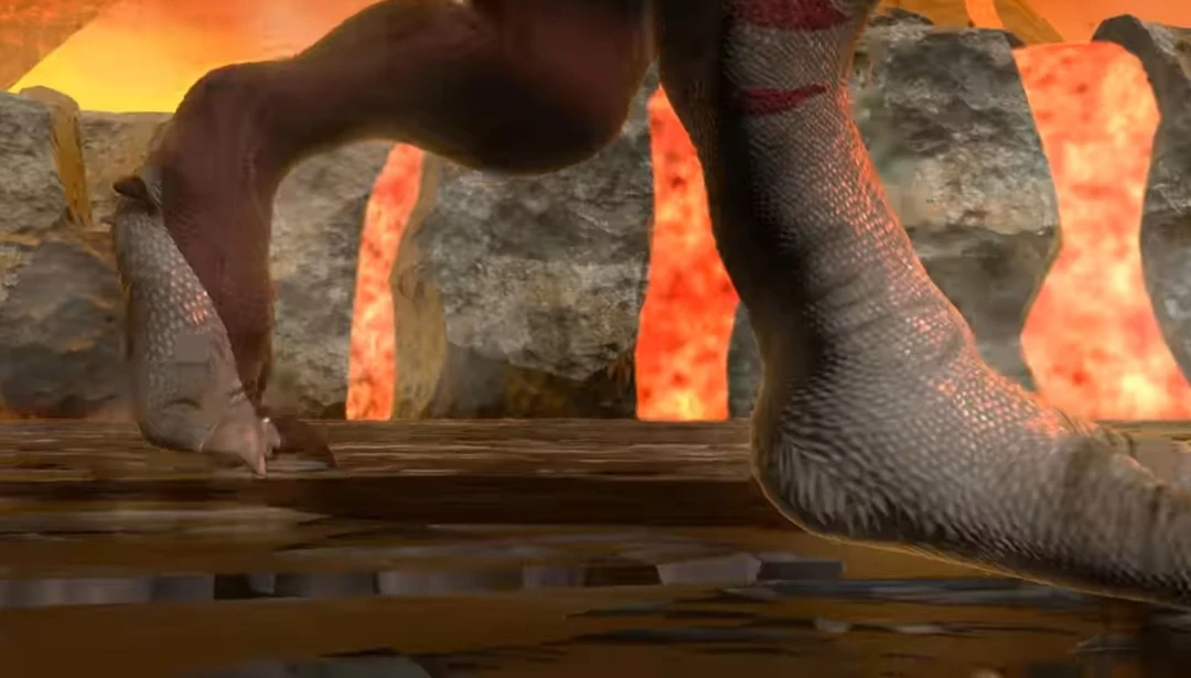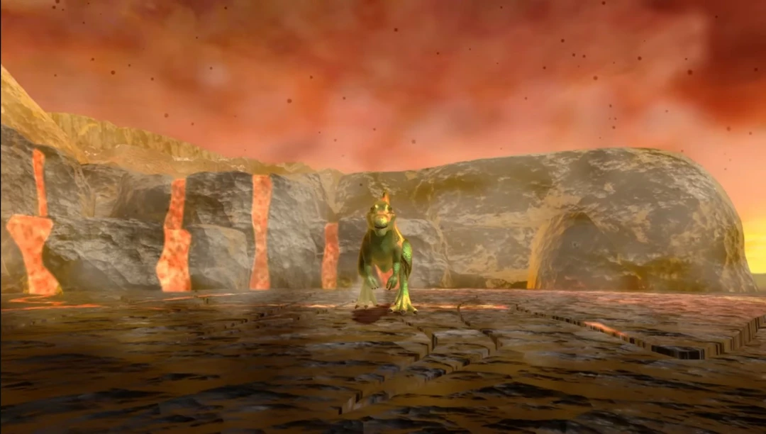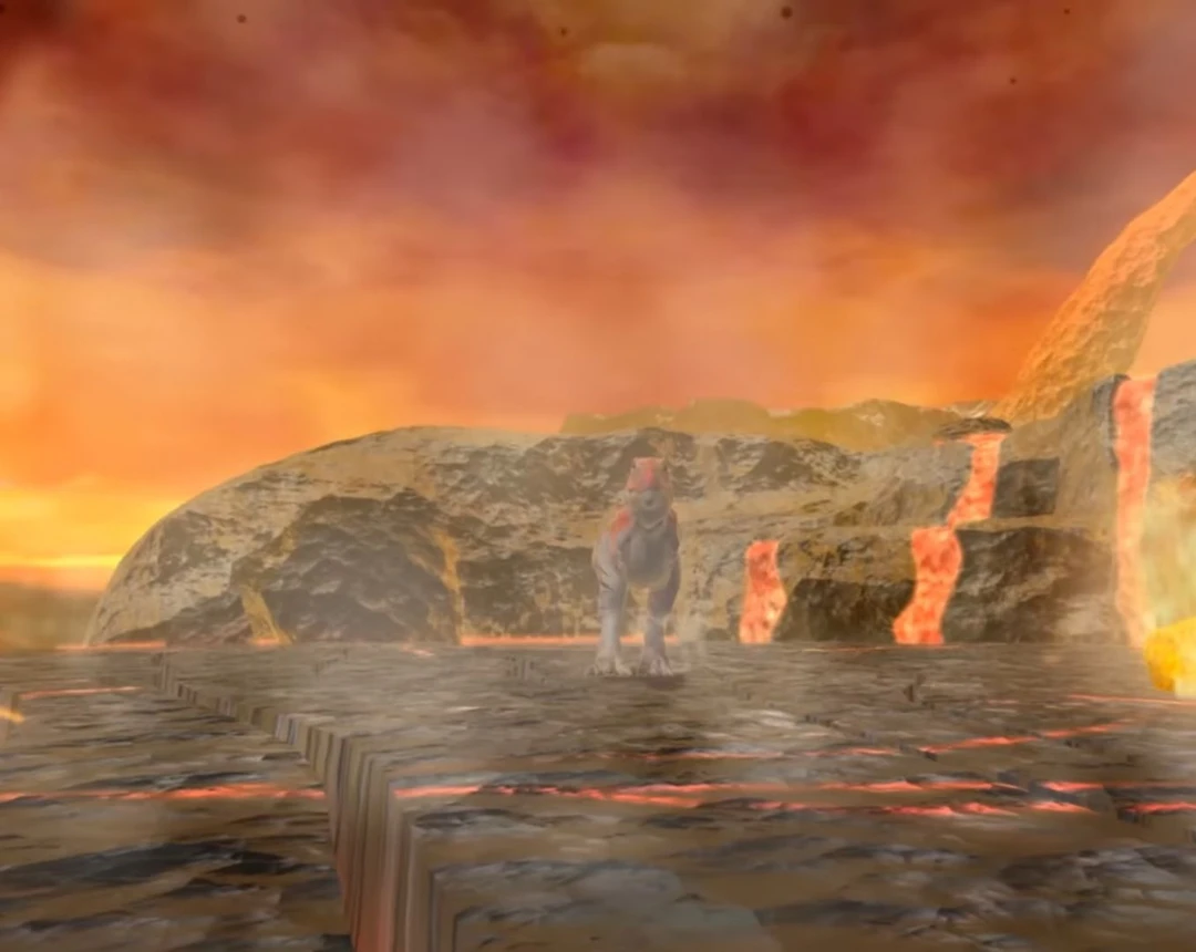 운석이 떨어지고 스피노도 그안에서 나오며 용암지대를 걸어간다