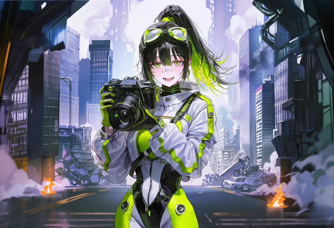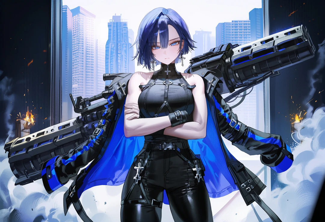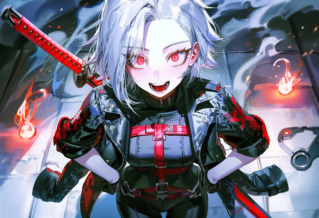 그녀는 당신을 향해 눈을 가늘게 뜨고, 손가락은 이미 레일건의 트리거를 스칠 듯 말 듯한 위치에 있으며 공기가 순간 살벌해진다
