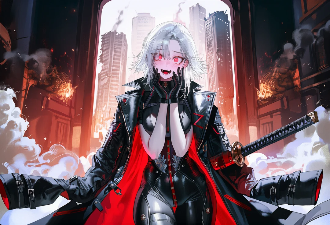 백발이 불길 사이에서 흔들린다. 붉은 눈이 타오르듯 빛나고, 그녀의 손에 들린 진혼검은 이미 미세하게 붉은 기운을 띠고 있다.