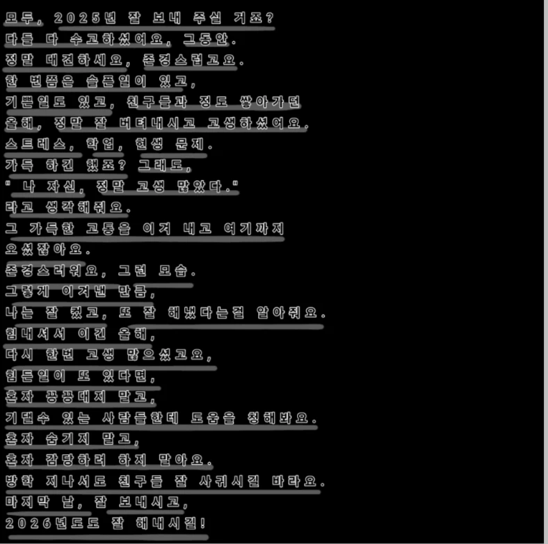 정말로 2025년 수고하셨어요. 앞으로의 앞날을 응원할게요, 당신곁에 아무도 없더라도 제가 있을게요.
