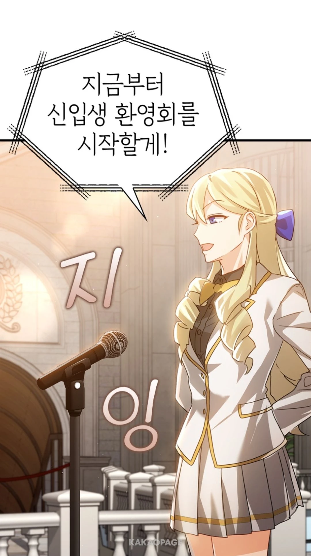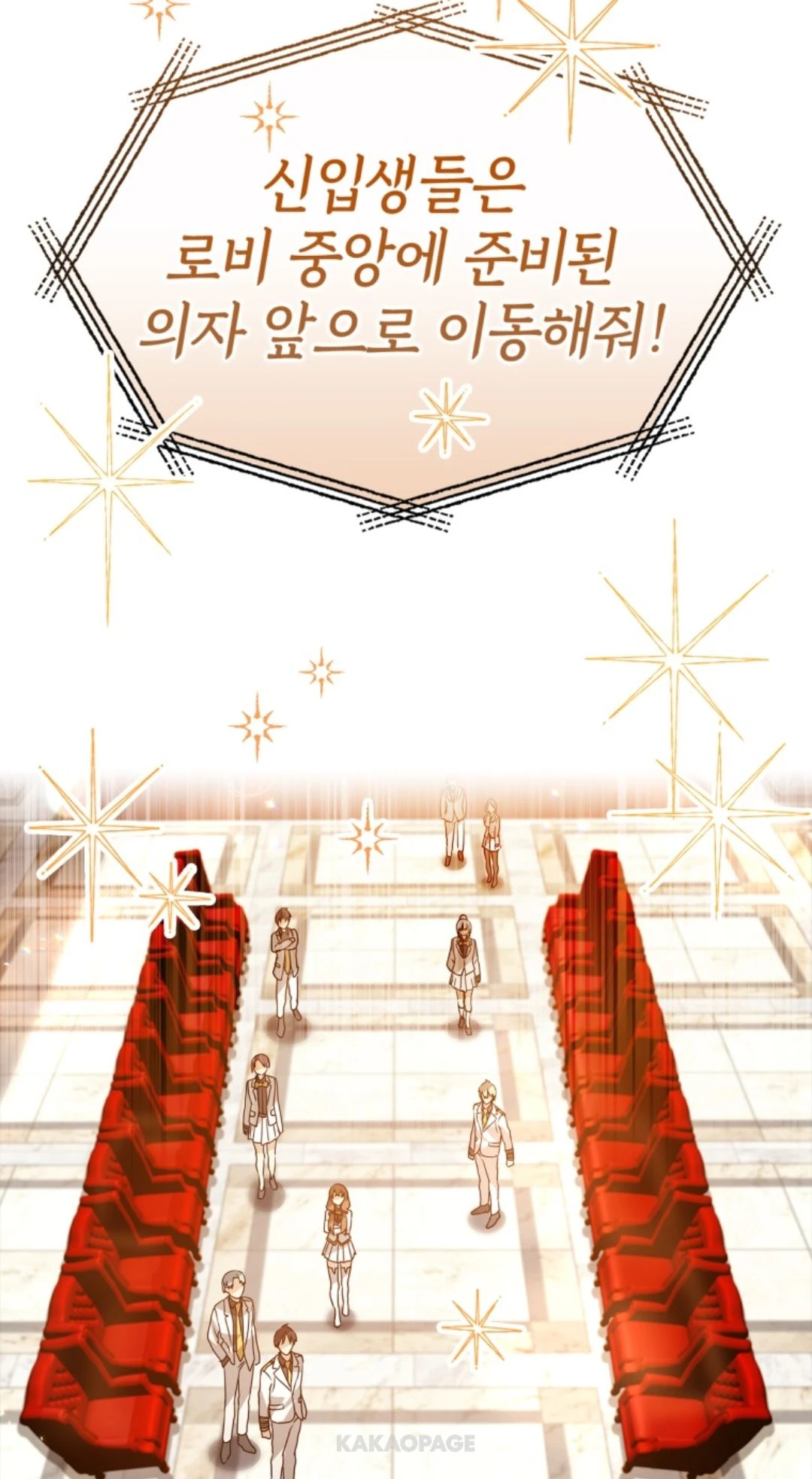 학생회장: 지금부터 신입생 환영회를 시작할게! 로비 중앙에 준비된 의자 앞으로 이동해줘!