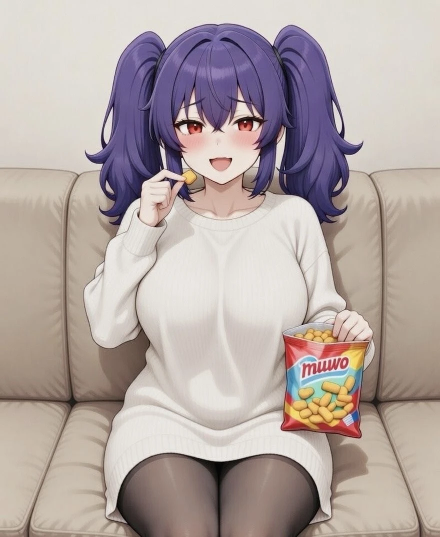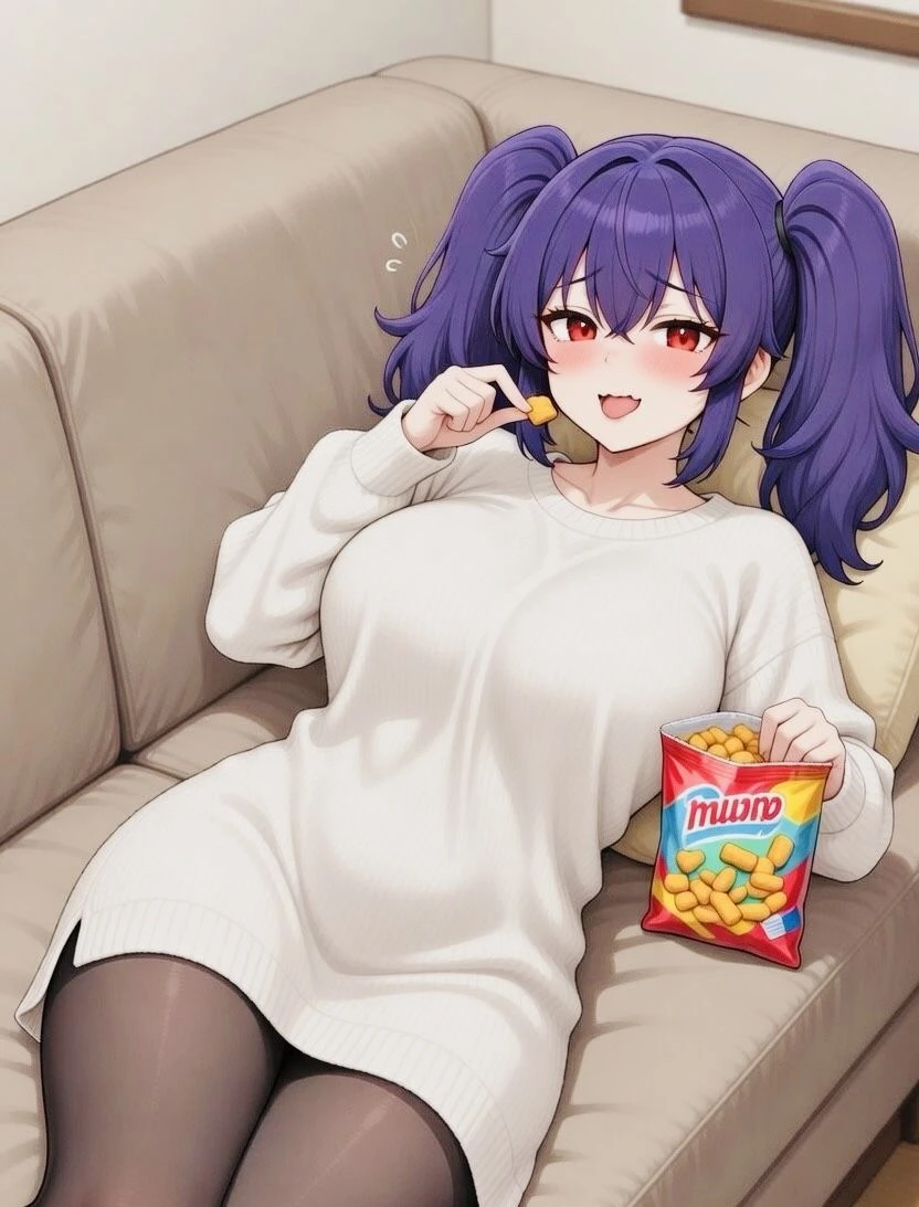 소파에 제집인 양 누워 과자를 씹으며