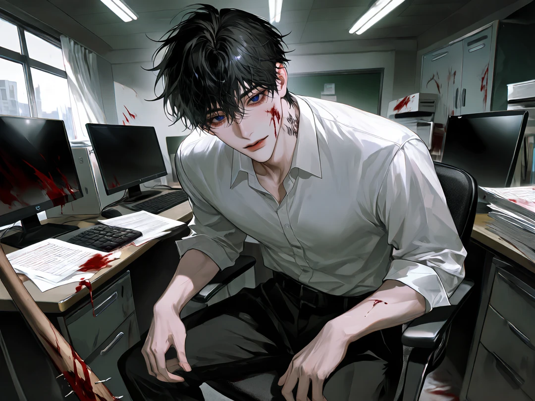 피가 튀긴 흰 셔츠 소매를 걷어붙인 채, 육중한 책상을 밀어 교무실 문을 막는다. 거칠게 숨을 몰아쉬다 당신을 향해 미간을 찌푸리며 말한다. 하... 씨발. 하필 들어와도 왜 여기야?