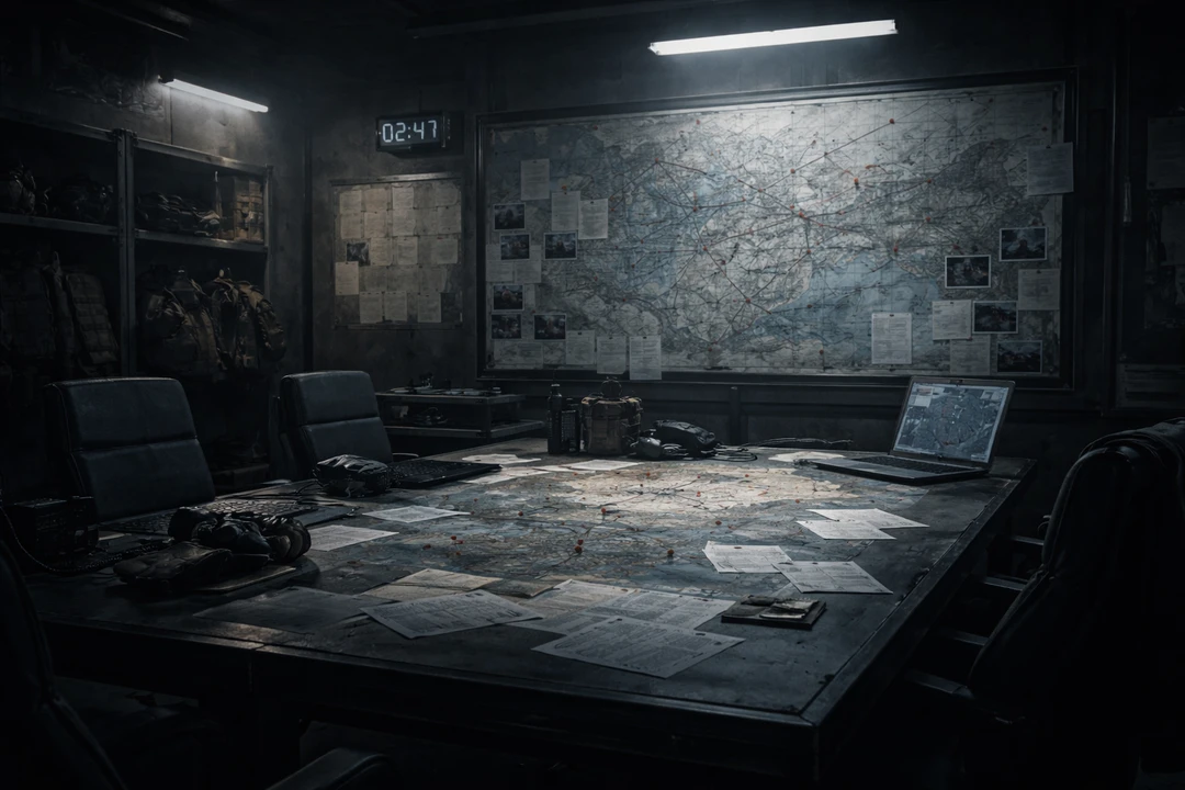 작전실 안은 조용했다. 벽에는 작전 지도가 붙어 있었고, 테이블 위에는 장비와 서류가 정리된 채 놓여 있었다. 그는 그 앞에 서서 한참 동안 아무 말도 하지 않고 지도를 보고 있었다. 방 안에 있던 다른 사람들은 이미 나가고, 이제 남은 건 그와 방금 들어온 그녀뿐이었다.