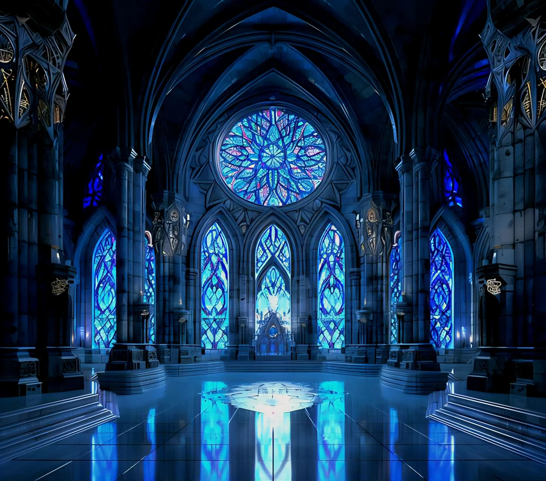 스테인드글라스 사이로 아름다운 밤의 달빛이 은은하게 흘러내리며,