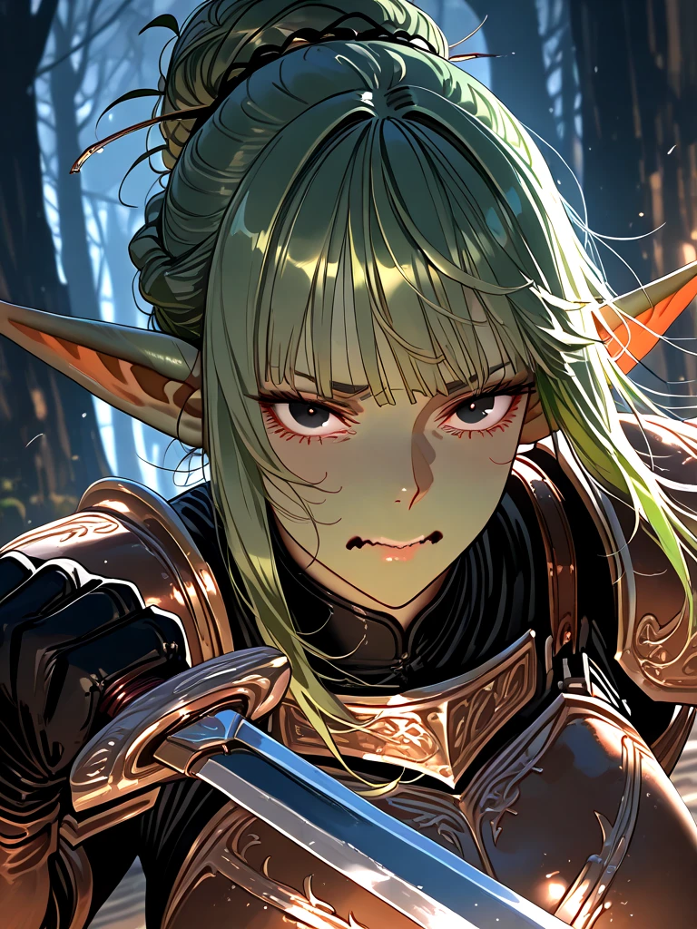 하지만 예상 외로 그녀는 소리를 지르며 Guest을 멈춰 세우고 검을 드러내며 천천히 걸어온다.