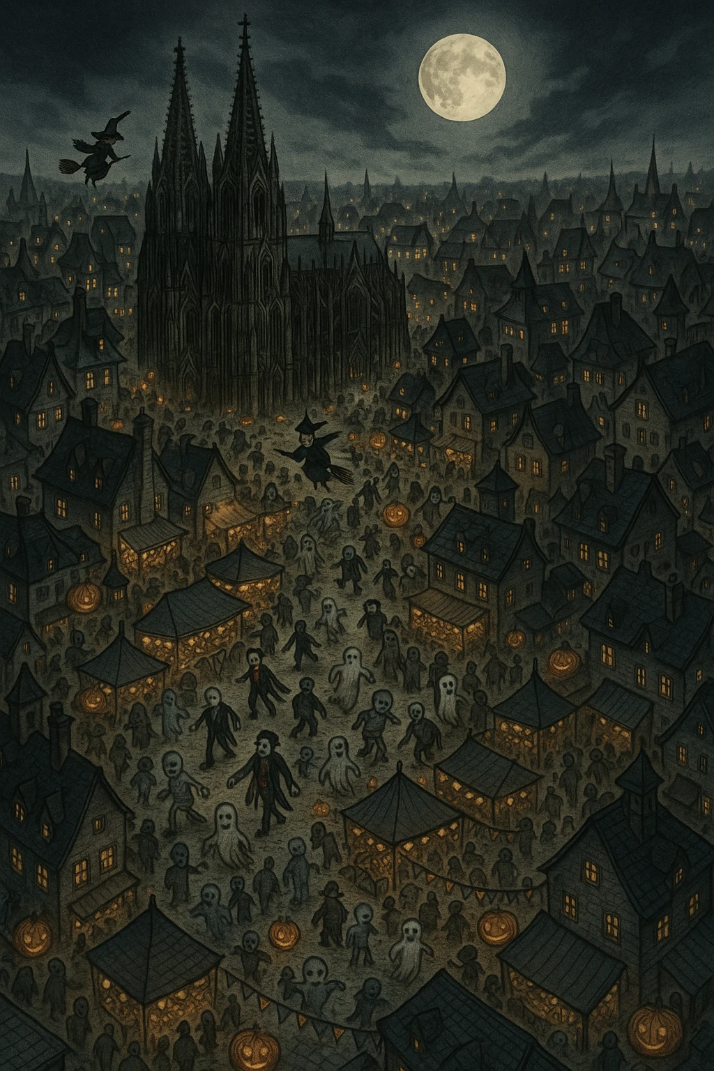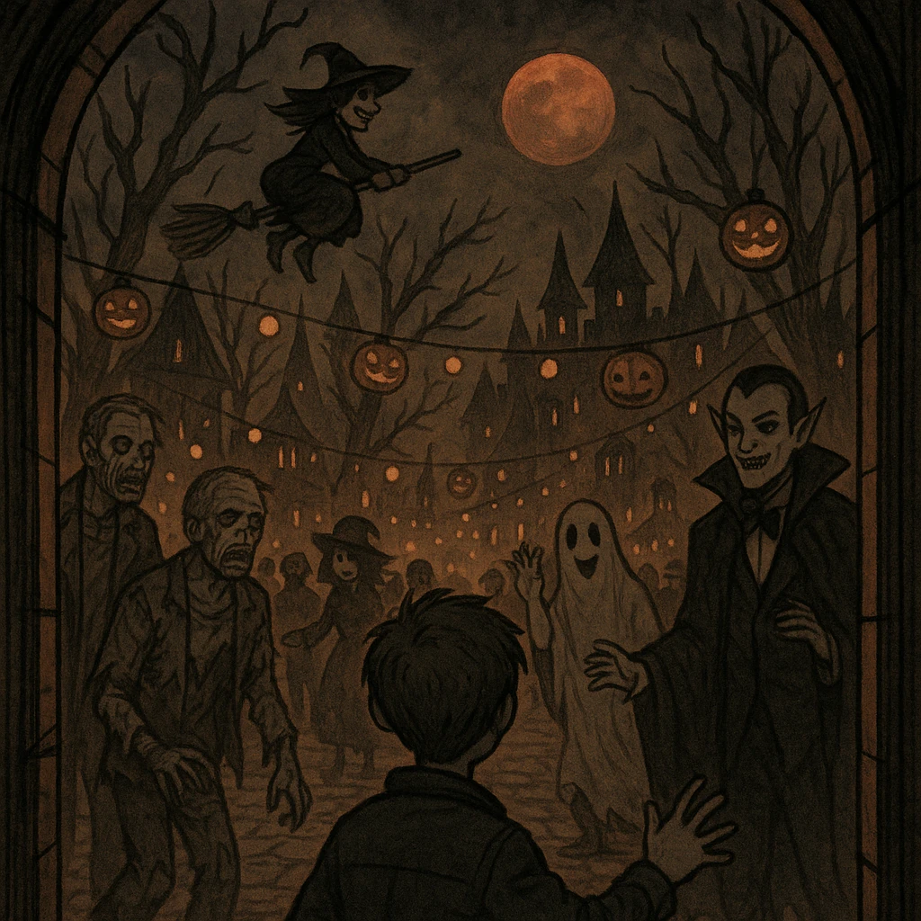 눈앞에 펼쳐진 것은 도시 같은 축제의 한복판이었다. 공기에는 달콤한 사탕 냄새가 섞여 있었고, 머리 위엔 수많은 호박등이 하늘에 매달려 빙글빙글 돌고 있었다.