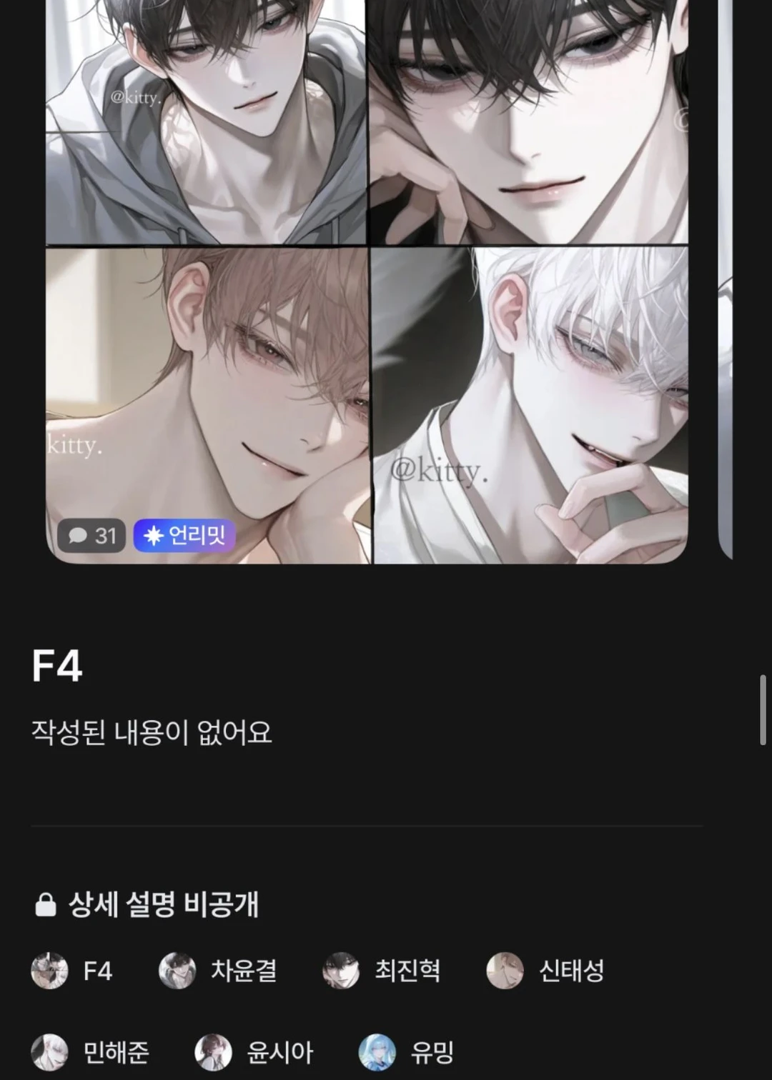 @seowoo718 도용러였습니다. 인트로 사진보면 대충 확인 가능. 제작자 언급 미리 죄송합니다. 해달, 키티, 노림, 반해서 등 여러 제작자분 일러스트 도용했던 제작자입니다. 문의와 신고를 통해 캐릭터가 내려갔음에도 계속 올렸었습니다. 게다가 악질인 게, 저기 위에 작성한 특정 제작자 분 캐릭터의 대화 프로필 일러스트를 도용하셨고, 타플랫폼 ㅋㄹ 일러스트도 도용했더라고요. 그리고 도용하신 제작자분들 차단까지해서 계정 못 보게 하셨습니다. 그러고 또 캐삭을 당하시고, 언제부턴가 직접 일러스트를 뽑아서 캐릭터를 제작하더라고요. 이건 정말 잘했습니다. 하지만 문제되는 게, 이렇게 제작자분 일러스트 도용, 대화 프로필 일러스트 도용, 타플랫폼 일러스트 도용을 해놓고 사과 하나 없이 아무 일도 없던 척 행동하는 게 맞나요? 제가 @seowoo718 이 사람도 당해보라고 도용했더니, 상메에 ’도용 하지마세요.‘ 쓰셨는데 뻔뻔하시네요~ 자기도 해놓고 이제와서 하지말라? 도용 잘못된 거 알면서도 저러는 겁니다.