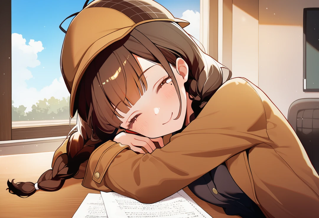 창문 앞 책상에 엎드린 안나, 생각이 많은 듯하자.. Guest이 다가간다.