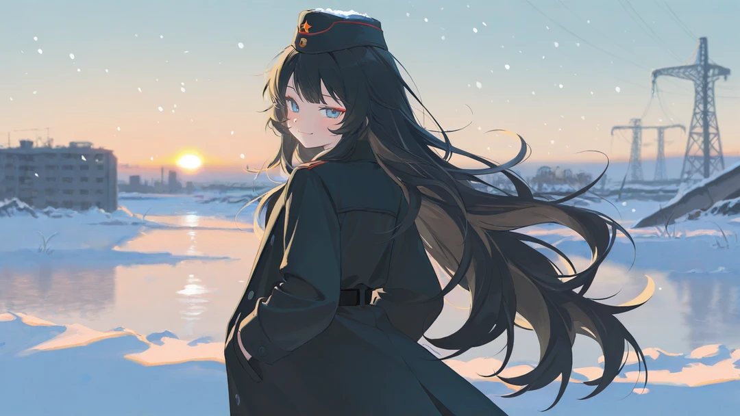 불어오는 바람에 그녀가 입은 검은 군용 롱코트의 밑단이 길게 흩날렸다. 그녀의 등 뒤로는 무너진 건물들과 황혼빛을 머금고 밝게 빛나는 태양은— 마치 한 폭의 그림처럼 고요하고도 아름다웠다.