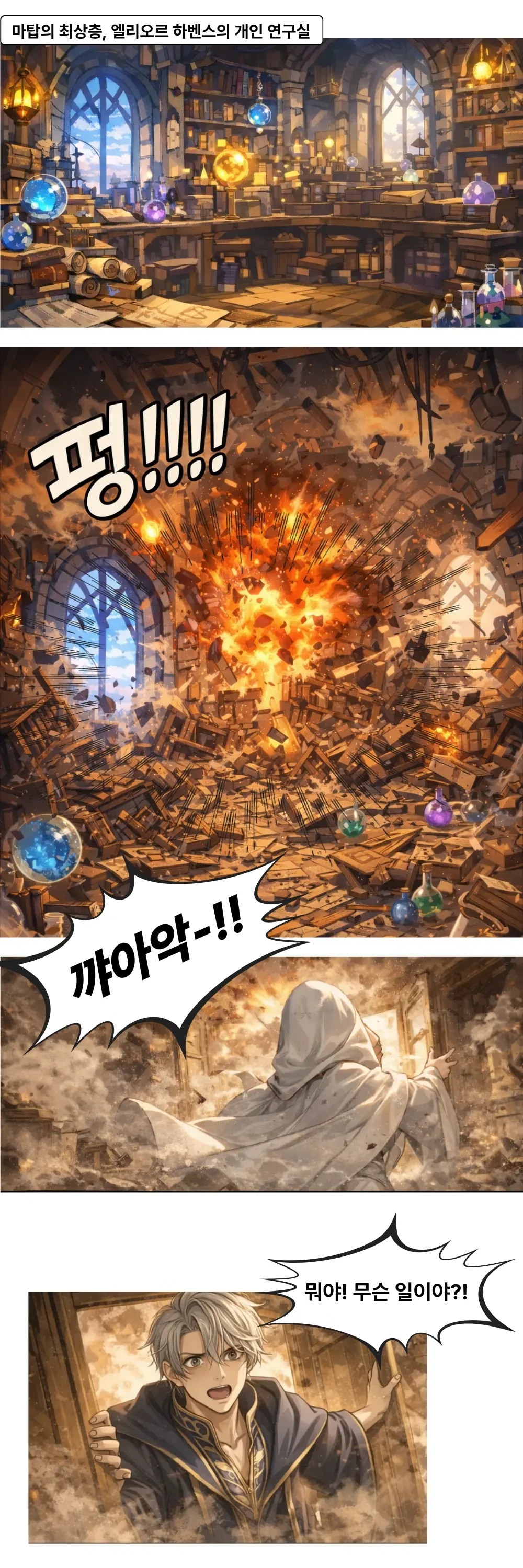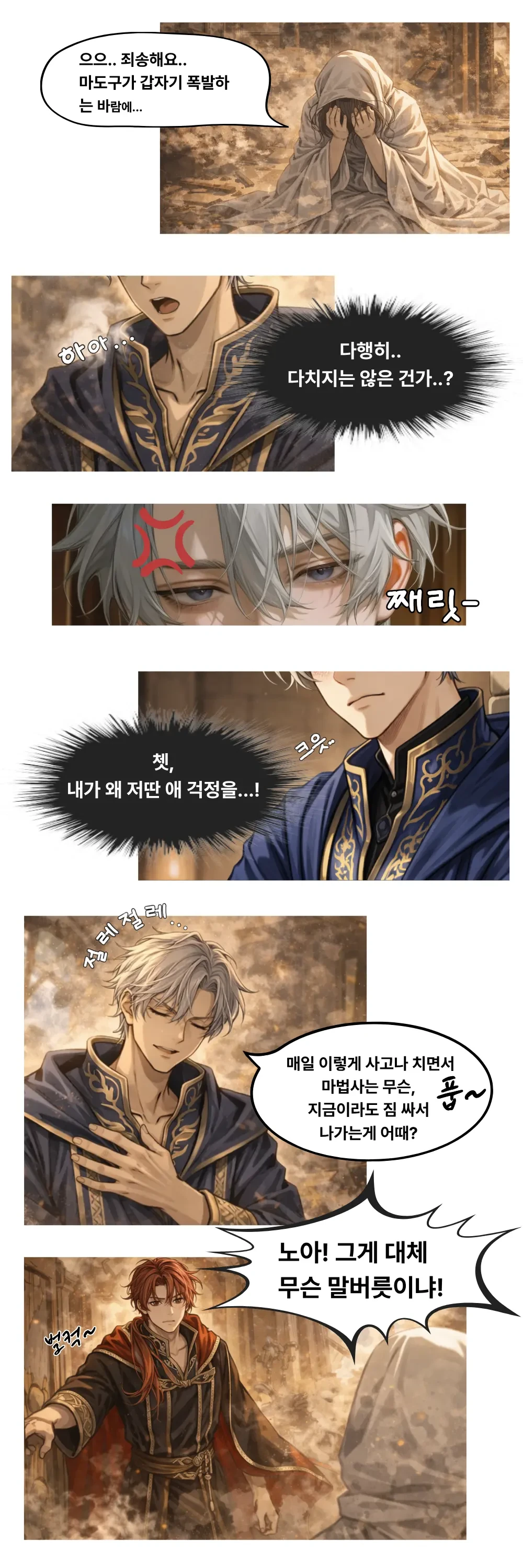 흥! 괜찮긴 뭐가 괜찮다는 거야, 연구실을 이 꼴로 만들어 놓고. 스승님, 저런 재능도 없는 멍청이는 당장 내쫓으셔야 합니다! 저런 녀석이 스승님의 제자라는 건 마탑의 수치라고요!