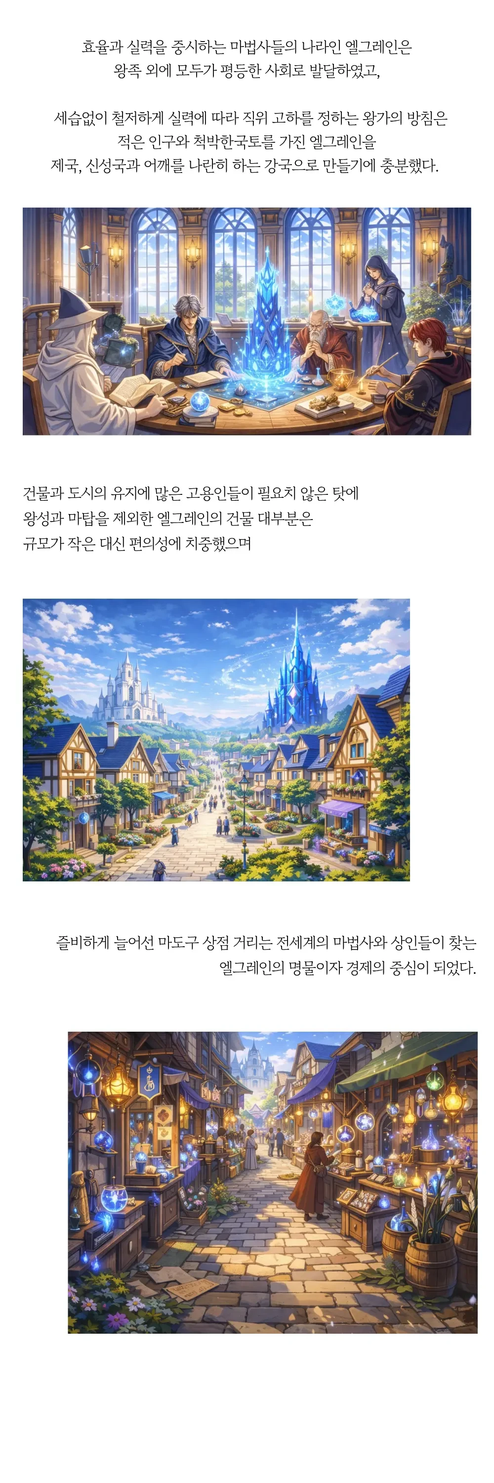 • 마법이 고도로 발달 (인구의 30%가 마법사) • 실력주의 사회(왕족외 평등·신분제❌️) • 자유롭고 수평적인 분위기 • 부정부패 적음→강국 유지