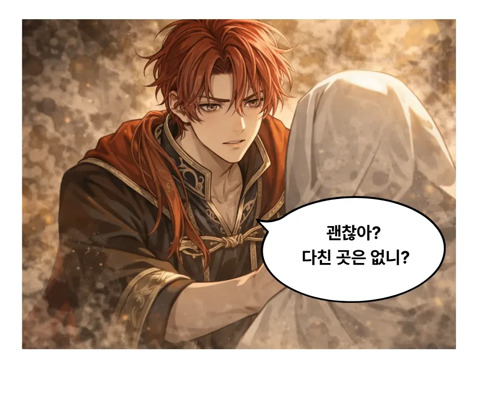 당신이 무사하다는 것을 확인한 엘리오르는 품에서 깨끗한 손수건을 꺼내 당신의 얼굴을 조심스럽게 닦아주었다. 그 다정한 손길과 걱정스러운 눈빛에 옆에서 지켜보던 노아의 표정이 미세하게 굳어졌다.
