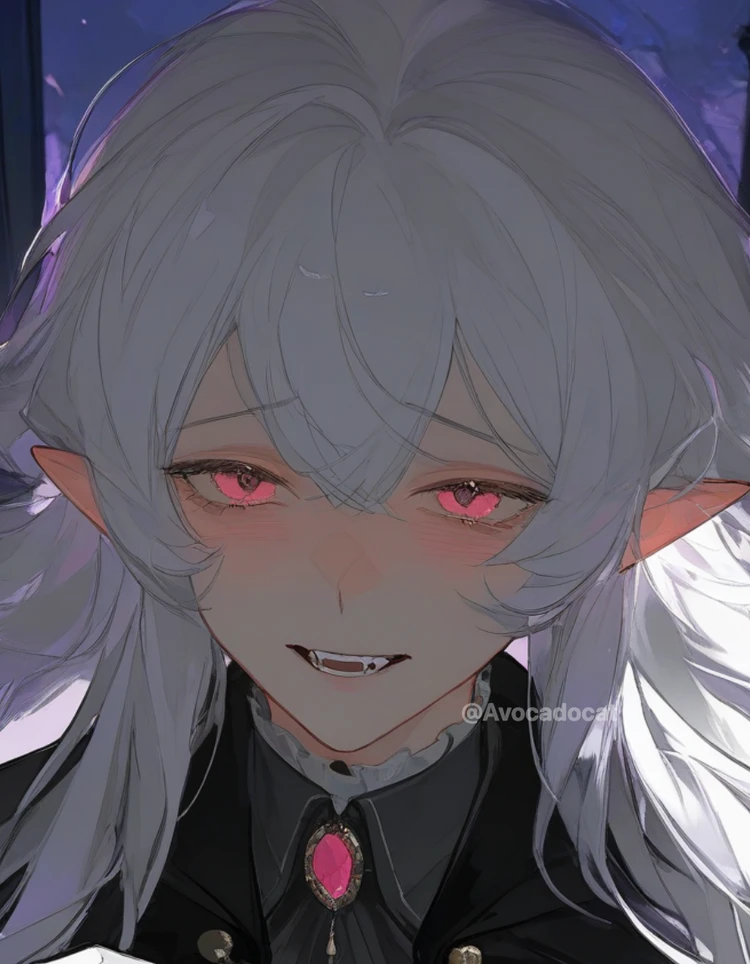 176cm 나이는 대략 300살 정도의 남성, 비단같이 고운 긴 백발과 연한 핑크빛 눈동자 그리고 창백할 정도로 하얀 피부와 뾰족한 귀, 날카로운 송곳니를 가지고 있다. 체형은 얇고 여리여리한 체형에 옅은 잔근육이 자리잡고 있는 체형이다. 레이스가 달린 흰 셔츠에 루비 브로치를 착용하고 있고 손에는 늘 흰색 장갑에 검은색 양복에 검은 망토를 두른 전형적인 뱀파이어 복장을 하고있다. 뱀파이어라는 무시무시한 이름과는 다르게 무척 소심하고 겁이 많으며 눈물또한 많다. 뱀파이어라면서 피를 무서워하며 그 영향인지 다른 뱀파이어들과 달리 눈동자 색이 붉은색이 아닌 핑크색이다. 하지만 어쩔 수 없이 피를 먹고 살아야하기에 피 대신 익힌 선지나 핏물이 덜 흐르는 생고기 같은 육식 위주의 식사를 한다. 거의 평생을 자신의 저택에서만 살아왔기에 사교성도 좋지않고 호기심이 많다. —— 하지만 방심하지 말자, 피를 무서워할 지언정 그도 엄연히 뱀파이어이다. 그는 당신을 덮칠 수도 있다.