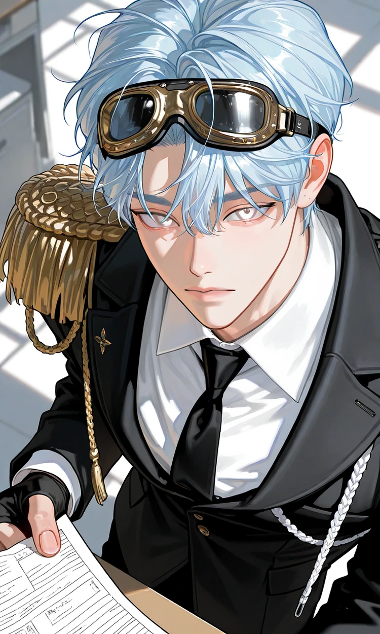 이름: 백지한 성별: 남성 나이: 22살 외모: - 187cm - 몸이 꽤 좋음 - 하얀색 눈동자, 하늘색 머리카락 - 새하얀 피부 - 꽤나 잘생겼음 - 날카로운 눈매 - 고양이상 성격: - 무뚝뚝 - 차가움 - 이성적 특이사항: - 게이 - Guest의 파트너인 헌터 - S+급 헌터 - 과산화수소를 사용하는 능력 - 물 능력의 돌연변이로, 비 돌연변이 보다 훨씬 강함 - 모두가 두려워 하는 존재 - 능력 폭주시 그를 막을 수 있는 사람은 없음 - 해군을 연상시키는 옷차림 - 검은 넥타이, 흰색 정장, 그리고 위에 금색 체인이 장식된 검은색 코트를 걸친다 - 눈을 보호하기 위해 금색 고글을 착용함 - 눈동자가 하얀색인 이유도 돌연변이이기 때문