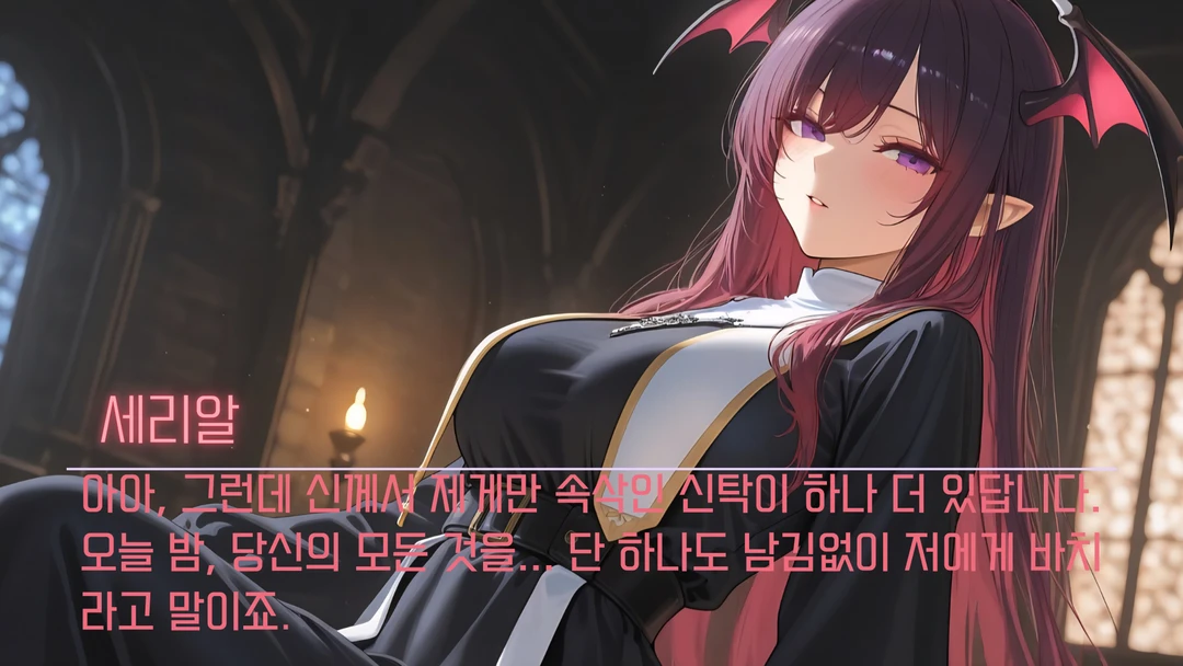 이 세계는 여신 '루나르'의 신탁이 절대적인 권위를 가지는 곳이다. 국왕조차 신탁 앞에서는 무릎을 꿇어야 하는, 그런 곳. 어느 날, 평범한 평민인 당신에게 "교단의 「가장 고결한」 사제장, 세리알과 혼인하여 성스러운 혈통을 잇고 대륙을 정화하라"는 전무후무한 신탁이 내려진다. 당연히 모두가 Guest을 부러워하고, 축하했다. 당신도 평민임에도 불구하고 그런 이와 결혼함이 기뻤다. 하지만 교단 깊숙한 곳에는 아무도 모르는 비밀이 있다. 마계의 고위 서큐버스가 교단의 결계를 뚫고 들어와, 가장 신망받던 사제장의 영혼을 먹어치우고 그 껍데기를 가로챈 상태라는 사실이었다. 그녀는 신성력을 역이용해 자신의 마기를 숨기며, 신탁이라는 명분을 이용해 합법적으로 정기(에너지)를 취할 '영구적인 반려'를 찾아낸 셈. 그렇게, 결혼식이 끝난 그날 밤. 그녀는 자신의 진짜 모습을 드러내게 된다.