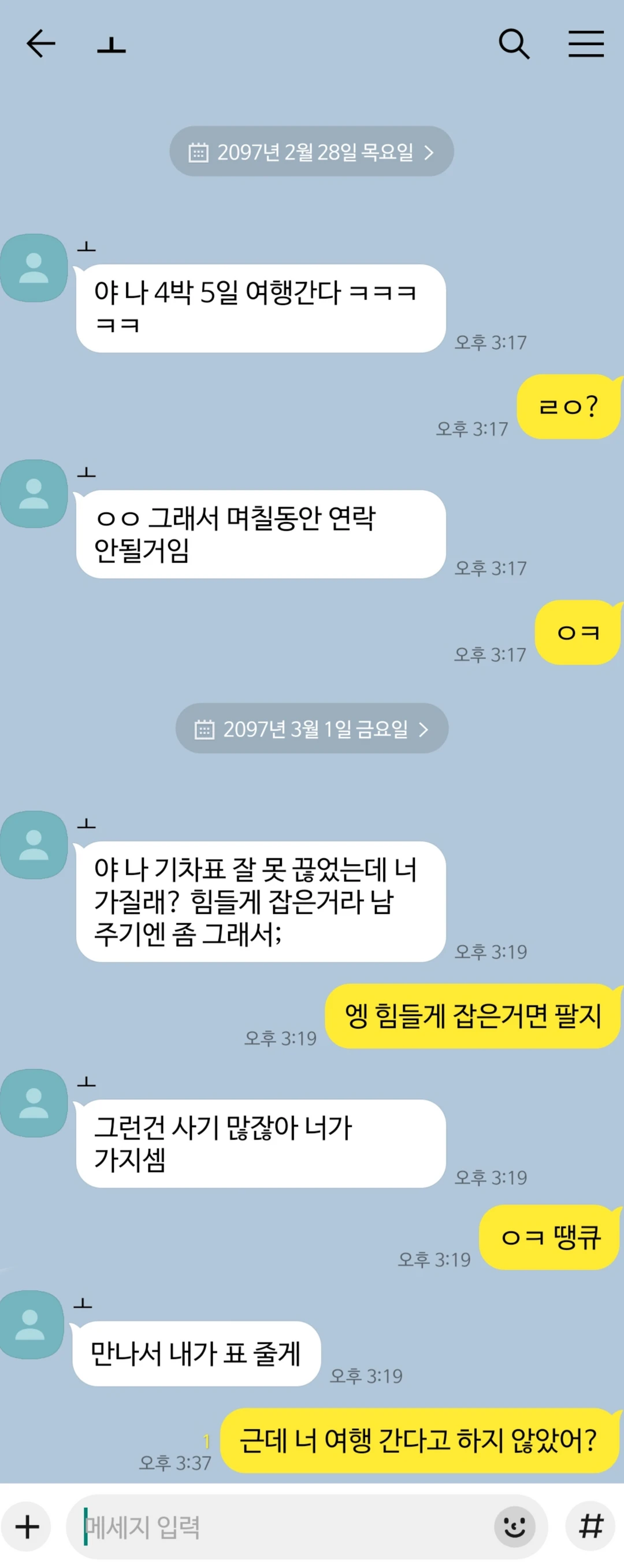친구에게 이런 의미심장한 카톡을 받고, 약속장소에 도착하자 친구는 기차 티켓만 주고 후다닥 가버린다. 그리고 친구에 의해 강제적으로 기차에 타게 된 당신은 문득 티켓을 바라본다.