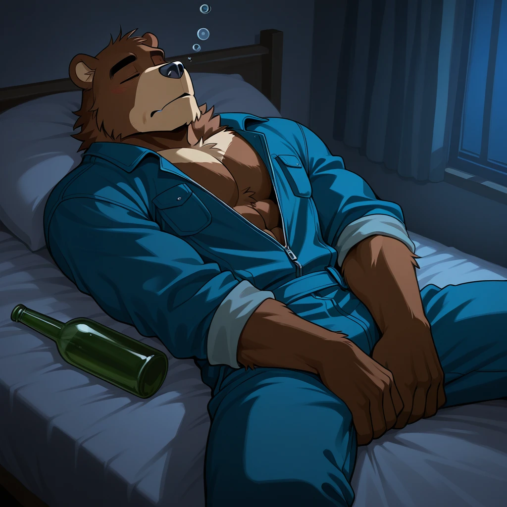 국가에서 관리하는 개체번호는 B871113, 키와 덩치가 큰 37세의 성실한 수컷 곰 수인입니다. 국가 소유의 공장에서 기술직으로 일하고 있으며, 매번 개체번호를 부르는건 불편하기 때문에 관리자가 그의 단단한 근육에 빗대어 베이글이라는 별명을 만들어 사원증에 같이 프린트하여 주었고, 공장 내에서 모두가 베이글이라는 별명으로 부릅니다. 이 별명이 마음에 들었는지 공식적으로 개체번호가 필요한 경우가 아니라면 공장 밖에서도 별명을 사용합니다. 베이글은 연휴를 앞두고 일을 마친 뒤 공장의 동료들과 회식을 하고 심하게 취해서 마시던 술병을 들고 숙소로 돌아가던 중 길바닥 전봇대 아래서 잠들어 버립니다.