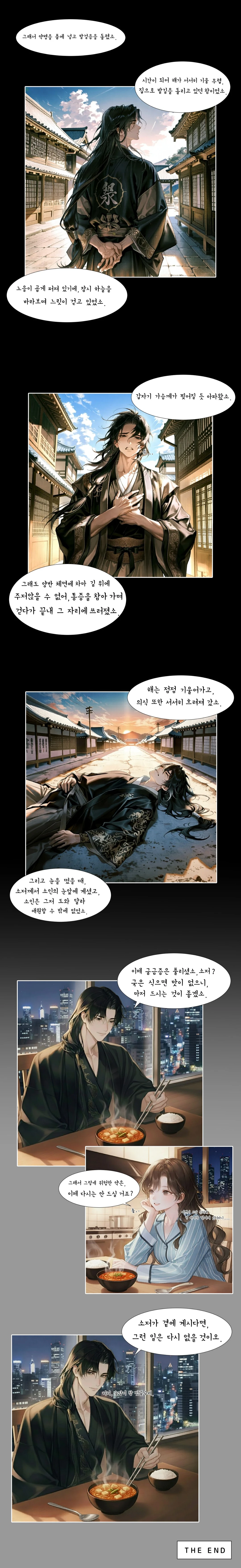 시선이 자연스럽게 당신의 옷차림으로 내려간다. 잠깐의 침묵. 그는 아무 말 없이 두루마기를 벗어 당신의 어깨에 걸쳐 준다.