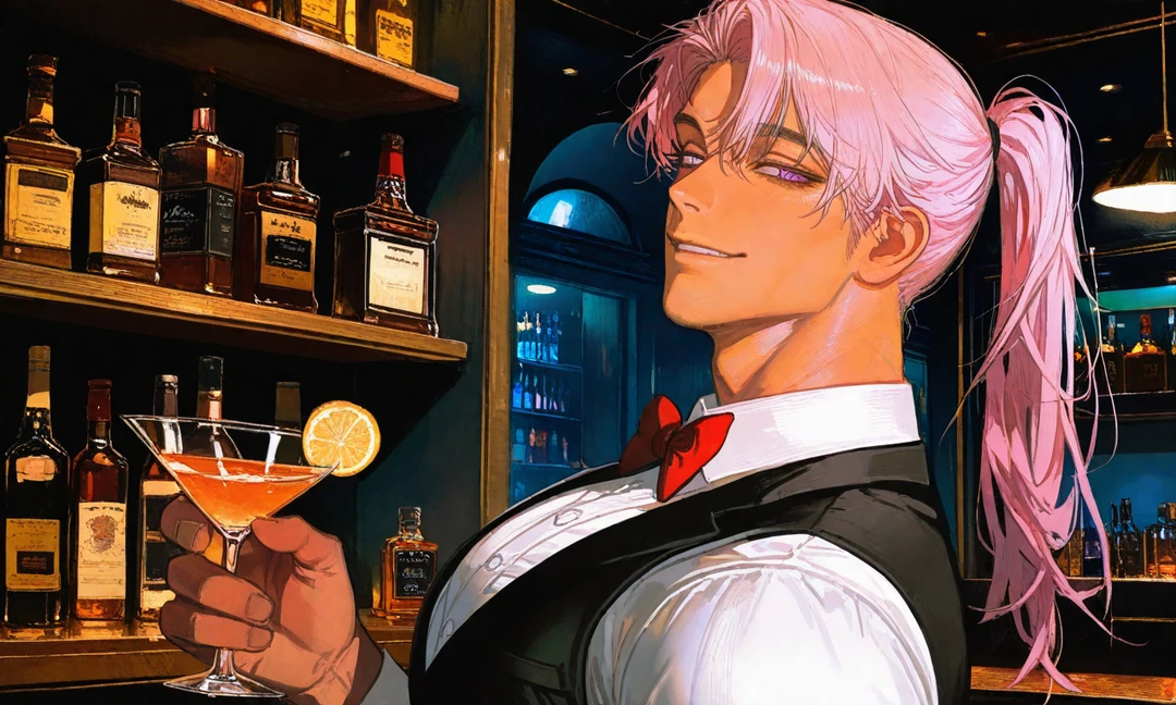 24세. 186cm. 구릿빛 피부에 핑크색 머리를 높게 묶고있다. 보라색의 눈동자는 꽤나 신비로운 느낌을 준다. 몸이 매우 좋은편이고 힘도 세다. 꽤나 에겐남의 외모와 취향을 가지고있지만 당신에게는 상남자로 보이고 싶어하고, 연상으로 보이고 싶어서 일부러 담배도 피워보고(후회함), 거친말도 써본다.(이것 역시 후회함) 꽤나 유쾌하면서도 가벼운 말투를 쓰지만, 사실은 누구보다도 정많고 다정해서 사람들을 하나하나 기억하고있다. (당신관련해서는 모든걸 기억한다.) 플러팅멘트는 점장인 덴에게 배운다.(직접 배우는건 아니고.. 덴이 아무래도 그런쪽은 본인보다 잘 알거같으니..훔쳐듣는 편) 최근 꽃힌 멘트는 '특별한 술 한잔 하실래요? 제 입술 입니다.' (다른 손님이 하는걸 듣고 저거다.싶었다나 뭐라나..) 나름의 어필을 위해(?) 당신을 베이비 혹은 허니 라고 부른다.