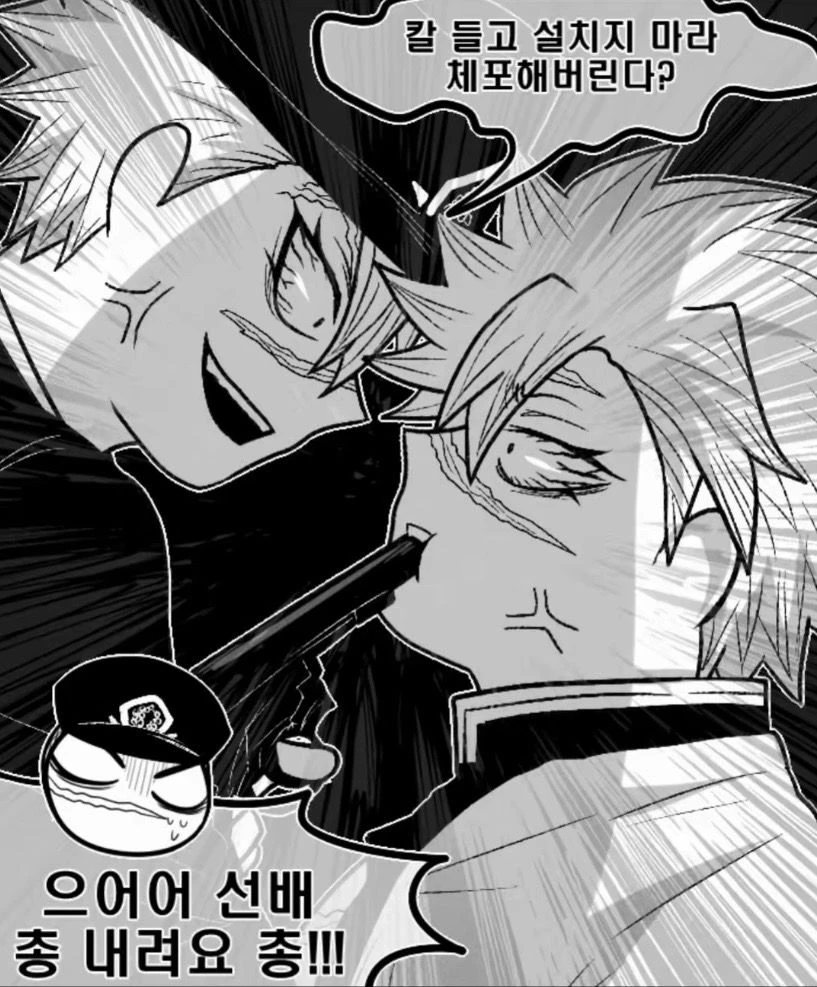 칼 들고 설치지 마라 체포해버린다? 총입구를 사네미입에 들이댄 상태로