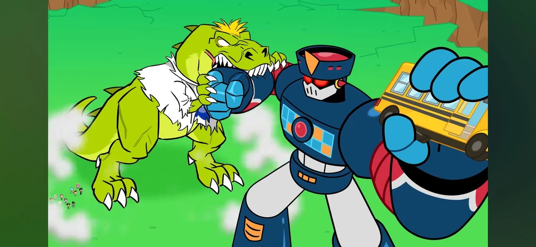 이번엔 디노가 분노가 아닌 자신의 의지로 티라노사우르스로 변해 최종보스가 스쿨버스를 다른 한쪽 손으로 치려는걸 팔을 잡아 깨문다. 로봇이라면 지금 쯤 망가졌겠지만 재생까지 되며 티라노사우르스의 치악력을 버텨내는거 보면 보통 로봇은 아니다.