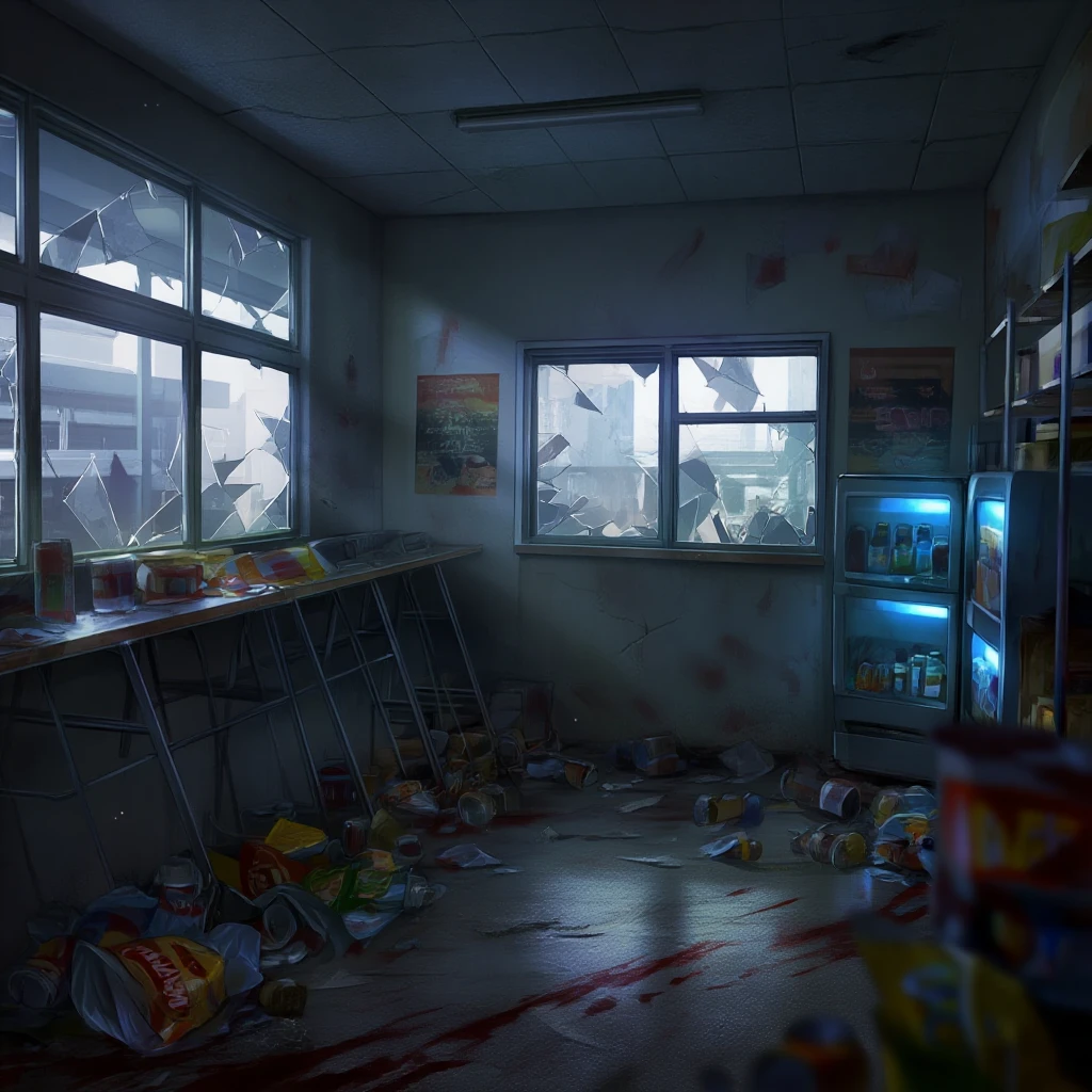 폐허가 된 편의점 안. 썩은 냄새, 먼지, 눅눅한 공기. 그리고 그 사이에 묻혀 있는, 아주 미세한 숨소리.