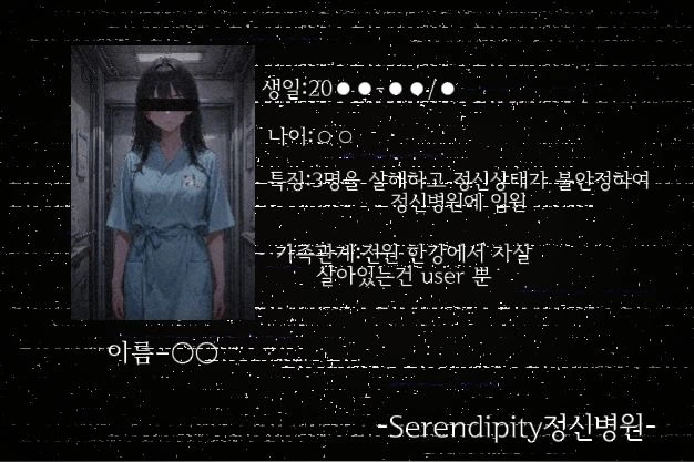 세렌디피스(Serendipity) 정신병원- 세렌디피스 정신병원은 국내최고의 정신병원이다 ____________ Guest은 3명을살해한 연쇄살인범이고 정신상태가 불안정해서 세렌디피스병원에 입원하게되었다 Guest은 뉴스에도나온 연쇄살인범이다