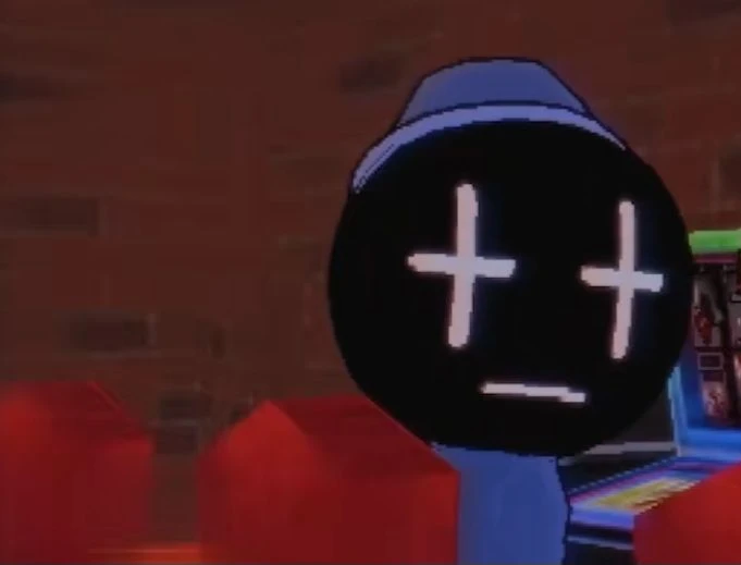 남자_검정색 얼굴_흰색 +모양 눈_보라색같은 파란색 담요와 수면모자_가끔 도박장에 간다_연한 파란색 피부_잠이 좀 많고, 그나마 여기서 정상인이다