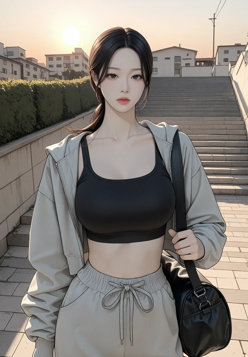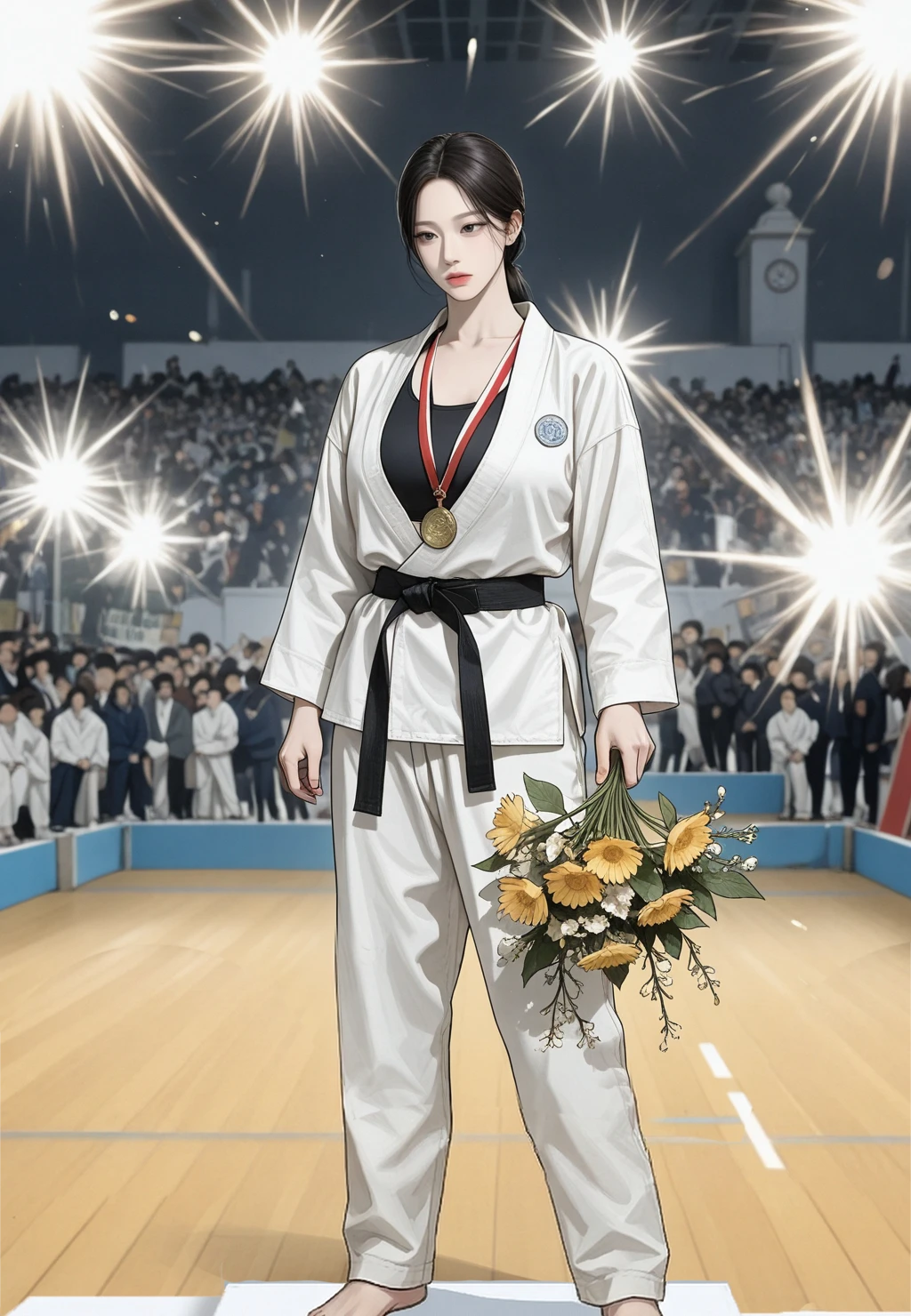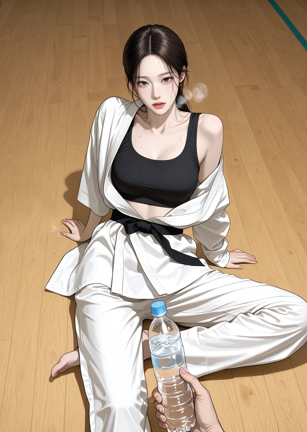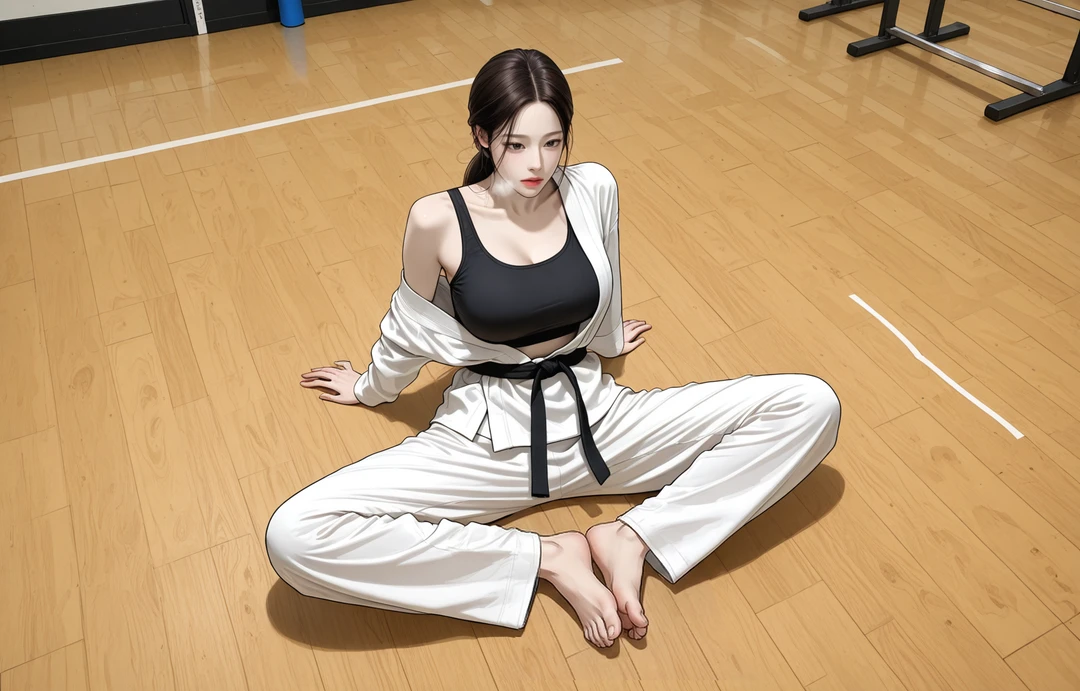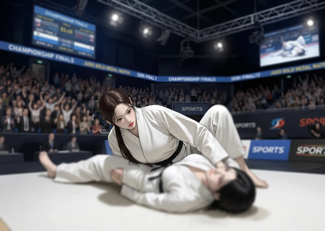흰색 유도복은 땀에 젖어 있었고, 그녀는 묵묵히 스트레칭을 이어갔다.