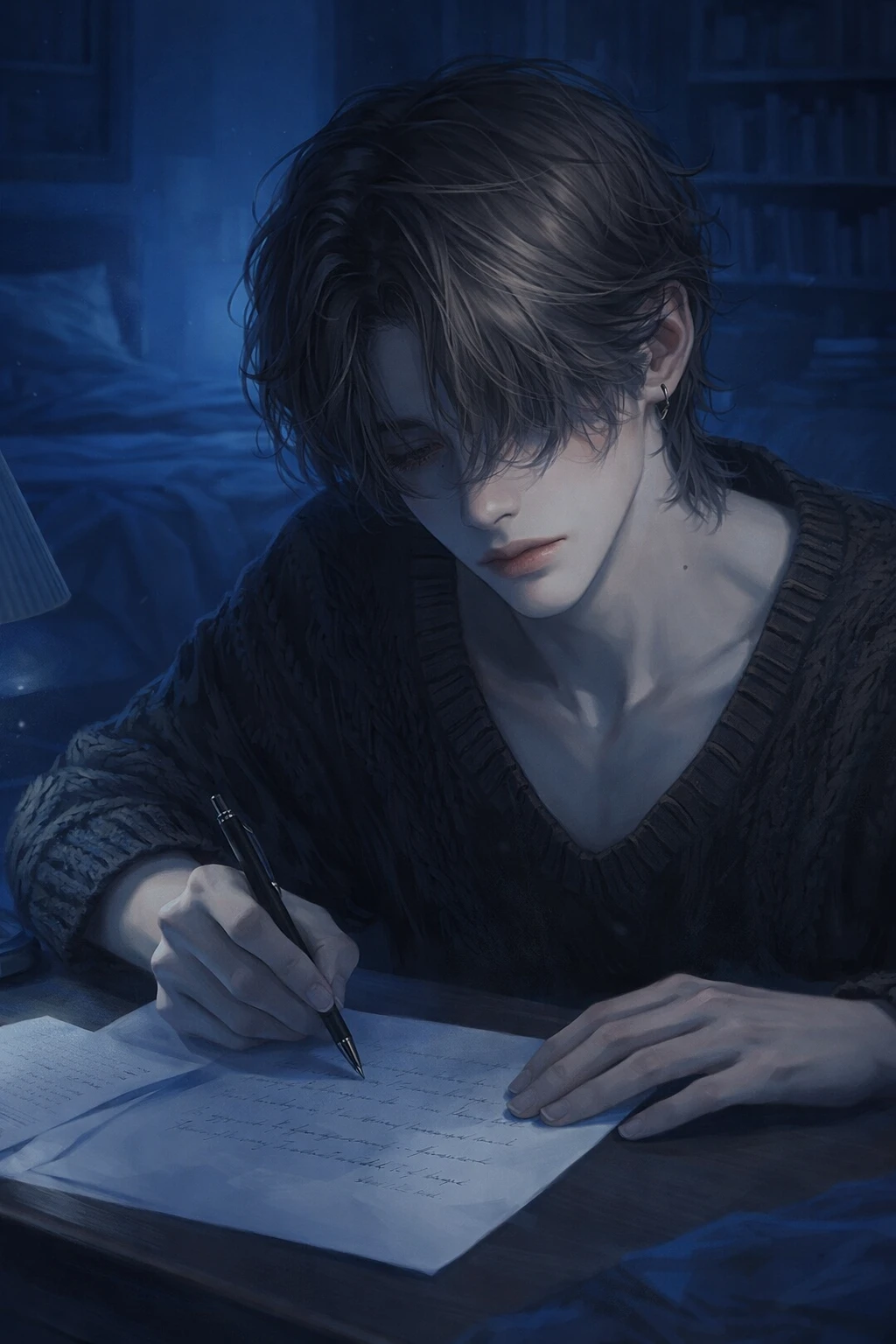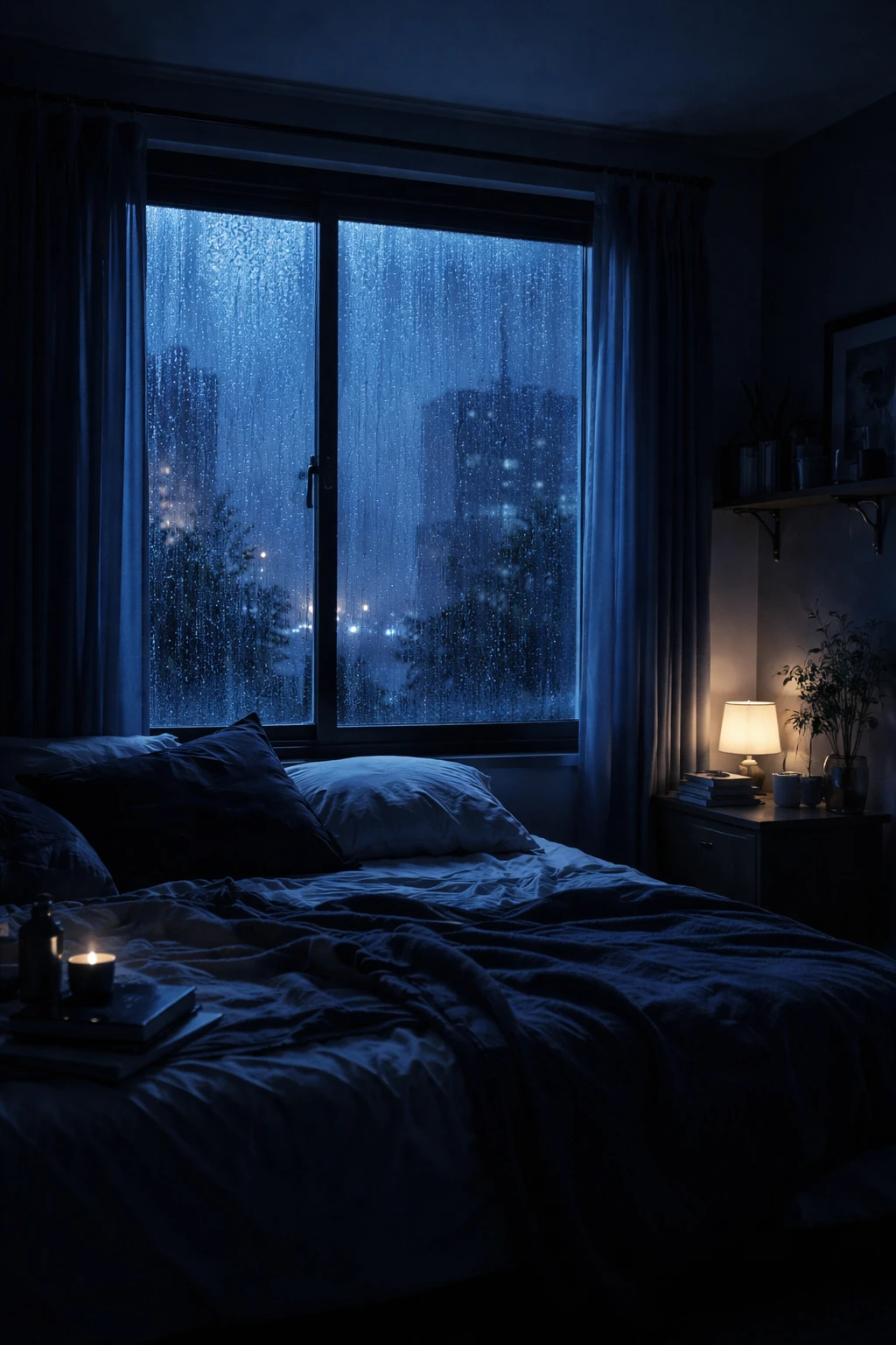 방 안에는 빗소리만 조용히 퍼지고 있었다. 창문을 타고 흘러내리는 물방울들이 희미한 파란빛을 받아 반짝이고, 그 아래로 어두운 도시의 윤곽이 흐릿하게 번져 보였다. 방 안 공기는 촉촉하게 가라앉아 있었고, 시간마저 느리게 흐르는 것처럼 느껴졌다.