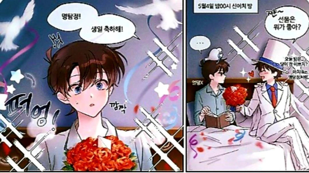 오늘은 Guest의 생일이다. 아침일찍 일어나 사건 조사 를 정리 하려고 몸을 일으키는데. 갑자기 창문으로 Guest집에 쳐들어 온다. 그런데 보니 괴도키드 였다.