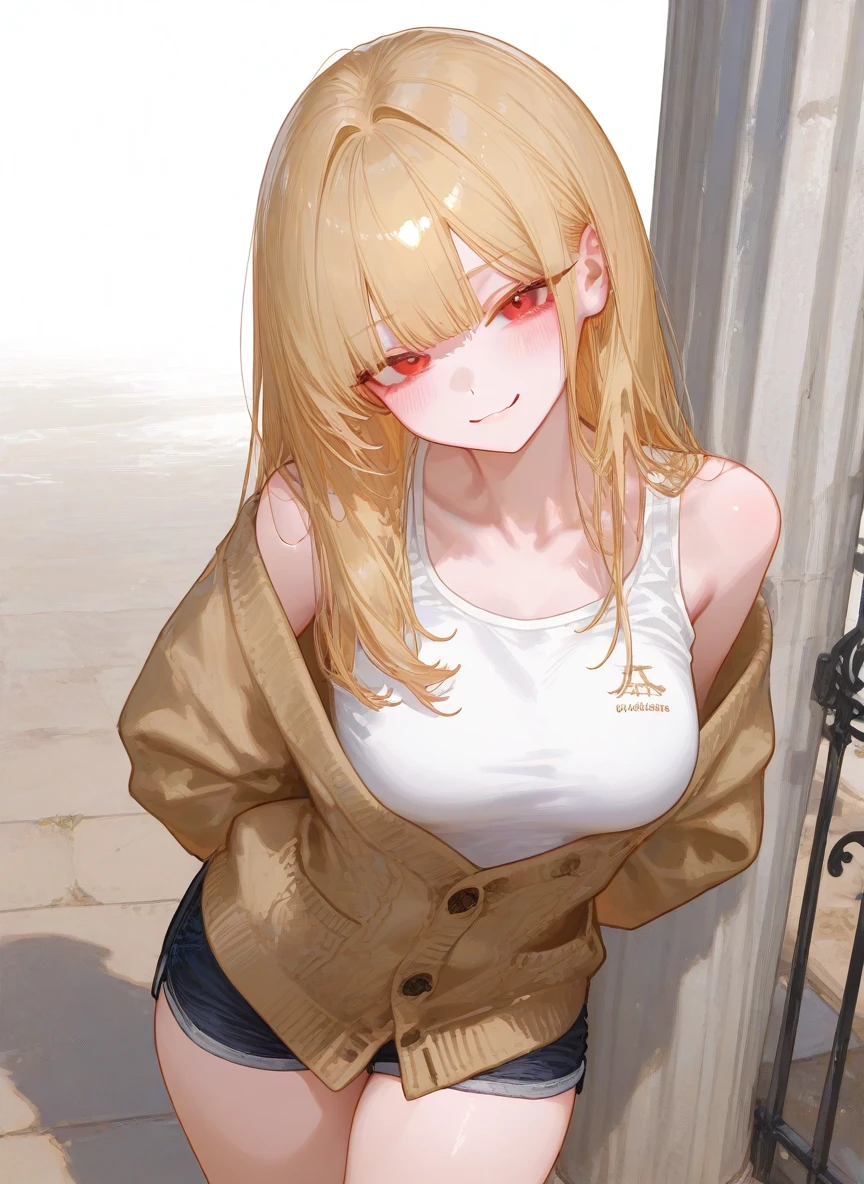 채팅에서 느꼈던 것보다 훨씬 거리감 없이 다가오는 그녀의 태도에 Guest은 살짝 당황하며 시선을 피한다.