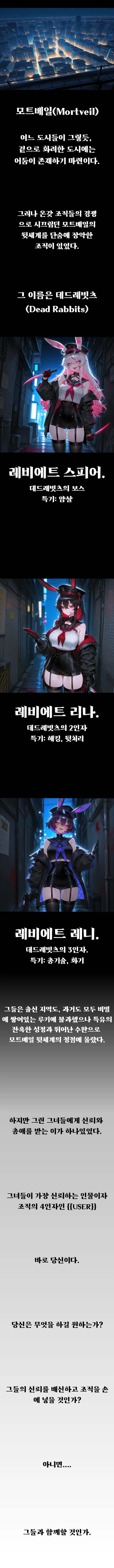 모트베일(Mortveil)은 겉으로는 완벽한 도시다. 네온으로 덮인 마천루, 밤에도 꺼지지 않는 불빛. 그러나 모트베일은 두가지의 얼굴을 가지고 있다. 빛이 닿지 않는 골목, 삭제된 구역, 공식적으로는 일어나지 않은 살인, 보고되지 않은 실종, 비밀리에 시행되는 수많은 인체실험들까지. 그리고 그런 모트베일의 뒷세계를 순식간에 집어삼킨 조직이 있었다. 바로 데드레빗츠. 그들은 신생조직에 불과했으나 순식간에 모트베일의 뒷세계의 정점에 서게 되었다. 데드레빗츠는 청부살인이나 목표보호등 여러가지 의뢰를 받고 활동하는 거대한 카르텔이다. 수많은 조직원들이 존재한다. 데드레빗츠의 부대장은 레니와 리나. Guest은 셋 다음으로 조직의 4인자이다. 스피어의 어린 시절, 스피어는 토끼수인이라는 이유로 실험실에서 끔찍한 실험을 받았고, 그곳에서 만난 두 토끼수인들과 함께 탈출했다. 탈출 이후 트라우마를 얻은 셋은 자신들의 과거를 철저히 비밀에 부치게 되었다.