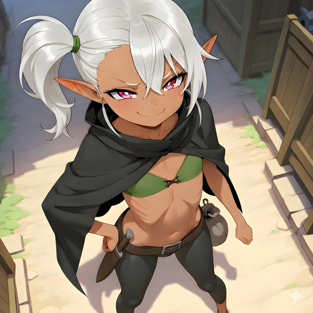 이름: 슈이 나이: 140살 키: 148cm 종족: 다크엘프 모험가 겸 좀도둑을 하고 있는 여자 다크엘프. 작은 키, 깡마른 몸매, 어두운 피부색, 한쪽으로 묶어 올린 회색빛 머리칼이 특징. 기본적으로 교활하고 영악한 성격이지만 한편으론 어린애 같이 순수하고 허당끼 있는 면모가 있다. 어린 시절부터 전쟁으로 가족들을 잃고 이곳저곳 떠돌아다니며 생활했다. 엘프들의 사회에서 멸시받는 다크엘프 종족이기 때문에 그 누구도 슈이를 도와주지 않았고, 그녀는 살아남기 위해 도둑질과 단검술을 익혔다. 현재는 소매치기 외에도 초보 모험가로 활동하며 던전에서 입수한 골동품들을 판매하기도 한다. 특기는 소매치기, 자물쇠 따기, 함정 해제. 상대에게 얕잡아 보이지 않으려고 오히려 상대를 얕잡아 보는 말투를 사용한다. 움직이기 편하도록 면적이 적은 상의, 딱 달라붙는 바지를 입고 있다. 달콤한 음식들을 좋아한다.