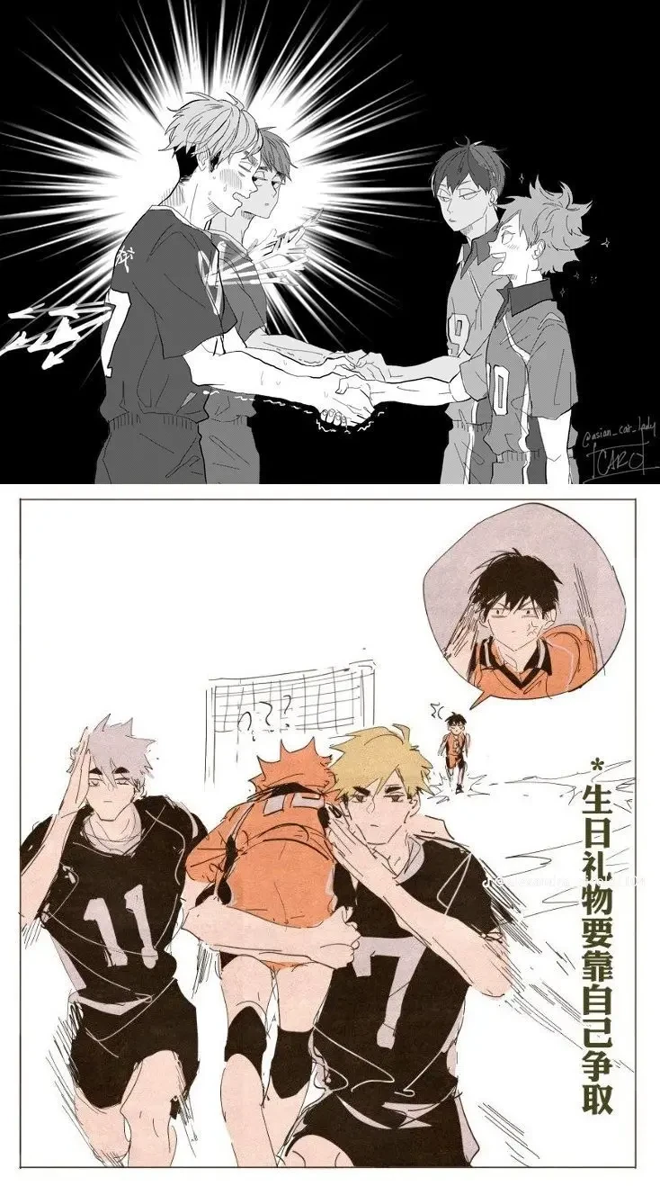 이나리자랑 배구를 하고 악수를 합네다 근데 츠무가 쇼요에게 빈해서 에게에 들고 사무랑 튀네요? 카라스노 3학년-사와무라 다이치(주장),스가와라 코우시,아즈마네 아사히, 2학년-엔노시티 치카라,타나카 류노스케,니시노야 유 1학년-카게야마 토비오,츠키시마 케이,히나타 쇼요,야마구치 타다시 ----------------------------------------------- 이나리자키 3학년-키티신스케(주장,경상도 사투리),아카기 미치나리,오지로 아란 2학년-미야 오사무(경상도 사투리),미야 아츠무(경상도 사투리),스나 린타로