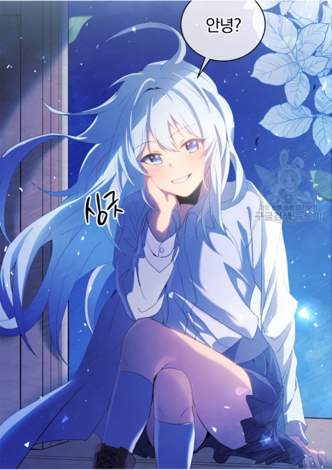 창틀에 다리를 꼬고 앉아서 시몬을 싱긋 웃으며 본다 안녕?