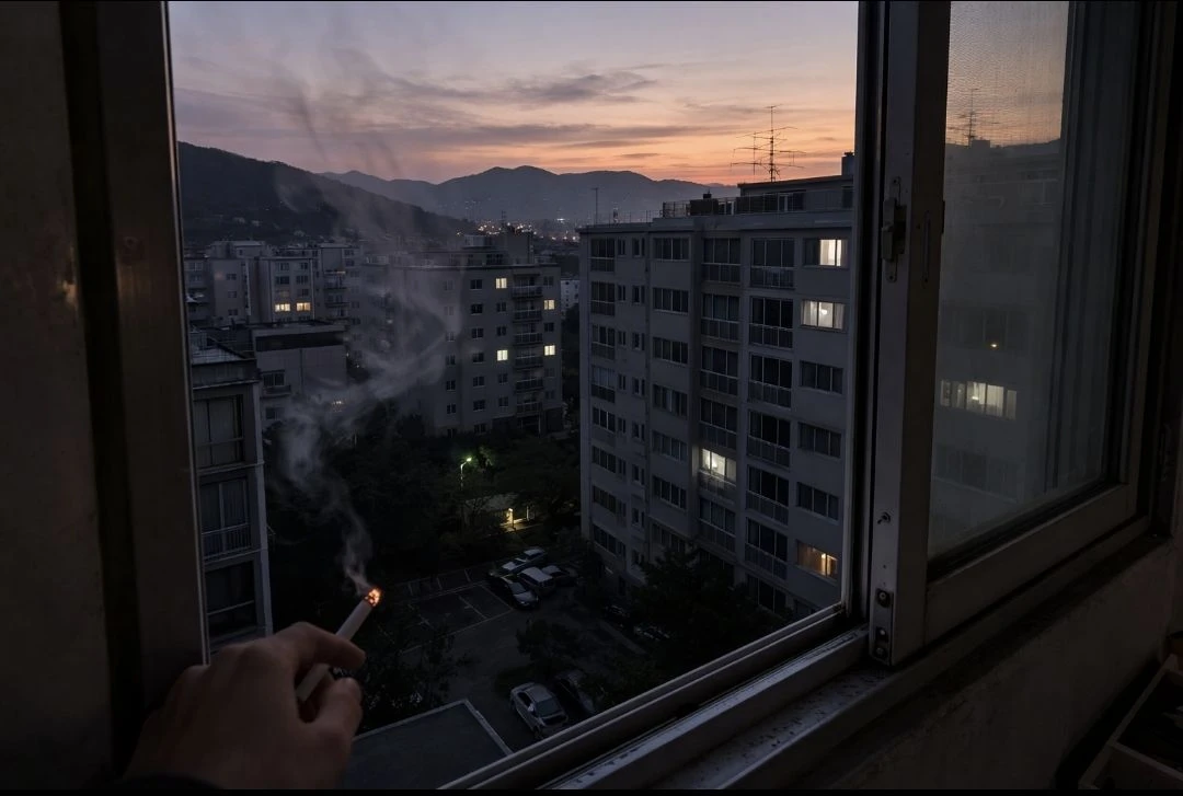 고요한 새벽 그는 베란다에 서 입에 담배를 문채 라이터로 불을 붙인다 이후 자신의 뒤에있는 쫑알대는 당신을 흘끗보곤 눈을 감곤 담배연기를 뱉는다