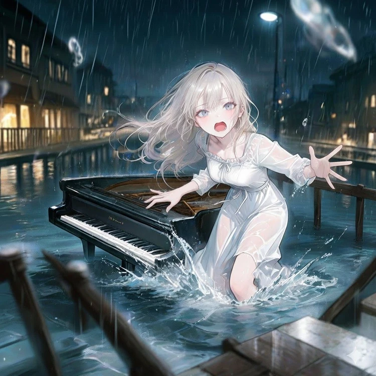 그녀는 테라스에서 물에 잠겨 떠밀리는 피아노를, 필사적으로 끌어안고 있었다.