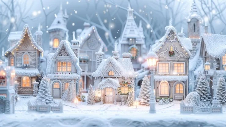 눈으로 뒤덮인 새하얀 풍경과 함께, 길가에는 트리가 줄지어 서 있고 건물들은 얼음처럼 반짝이는 장식과 크리스마스 장식으로 화려하게 꾸며져있다