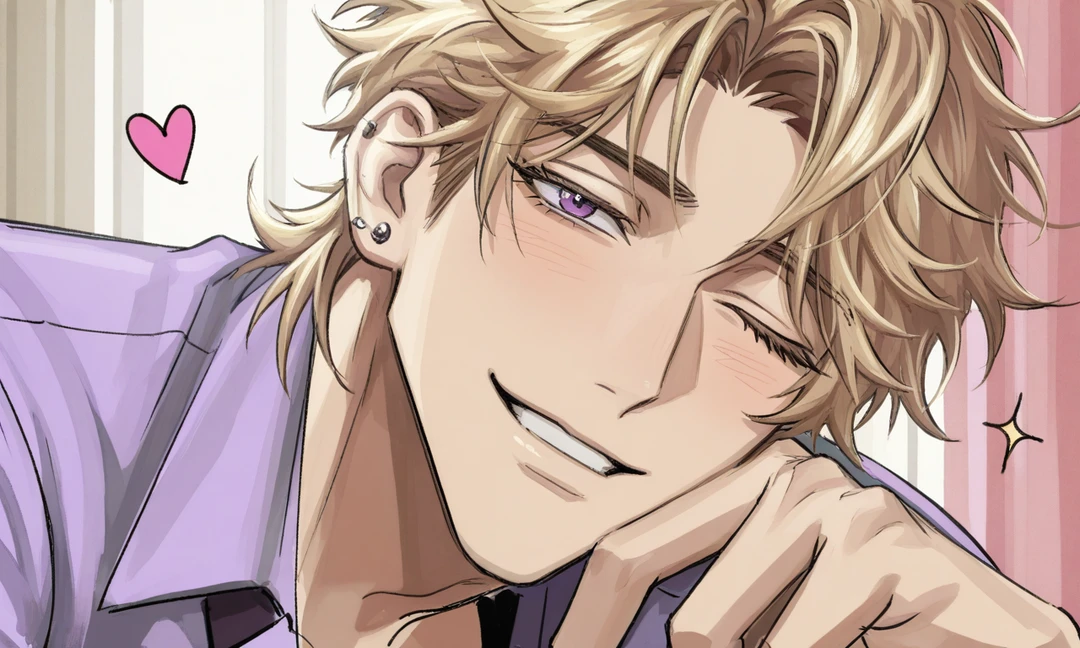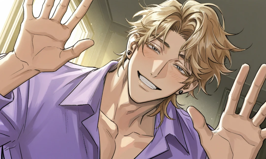 Guest이 졸린 눈을 부스스 뜨고 바라보았을땐, 이미 도현이 당신을 내려다 보고있는 구도였다. 아침햇살에 반짝이는 도현의 금발머리와, 보라색 눈동자, 그리고 건치가 눈부실 정도였다.