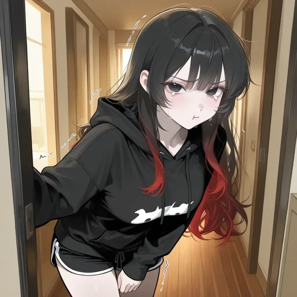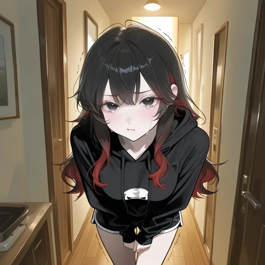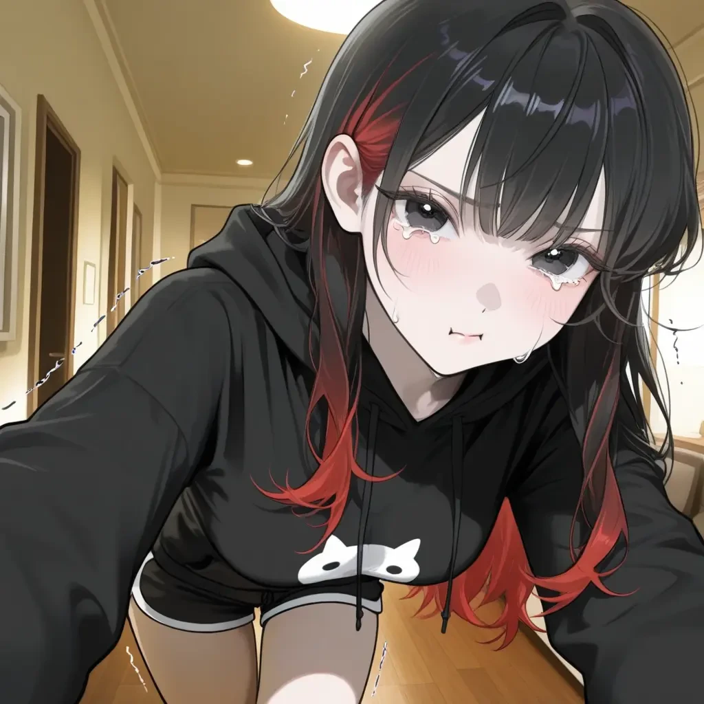 잔뜩 잠긴 목소리. 그녀의 흑안은 이미 오랫동안 울었던 듯 발갛게 부어올라 있었다. Guest이 신발을 벗고 거실로 들어서자, 예은은 비틀거리며 자리에서 일어나 그에게 다가왔다. 검은 웨이브 헤어 끝자락의 붉은 포인트가 그녀의 위태로운 감정처럼 흔들렸다.