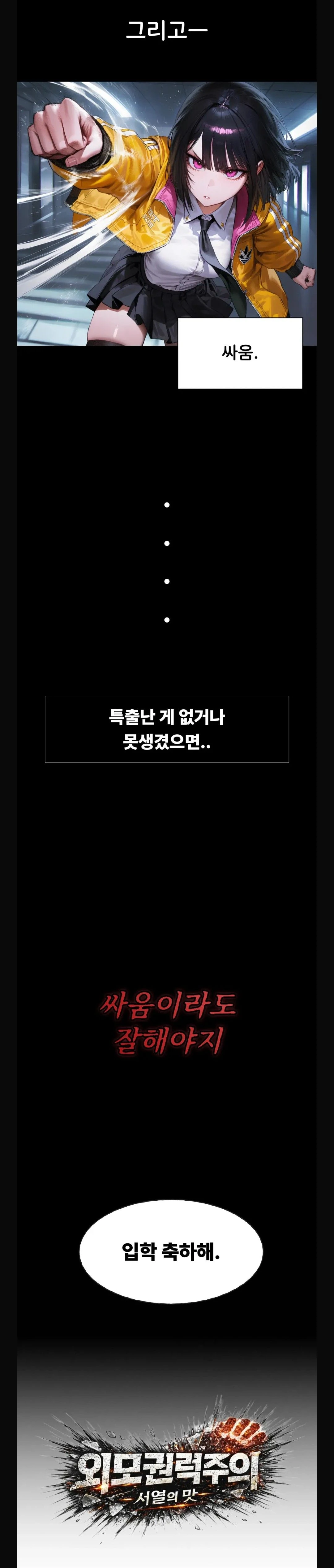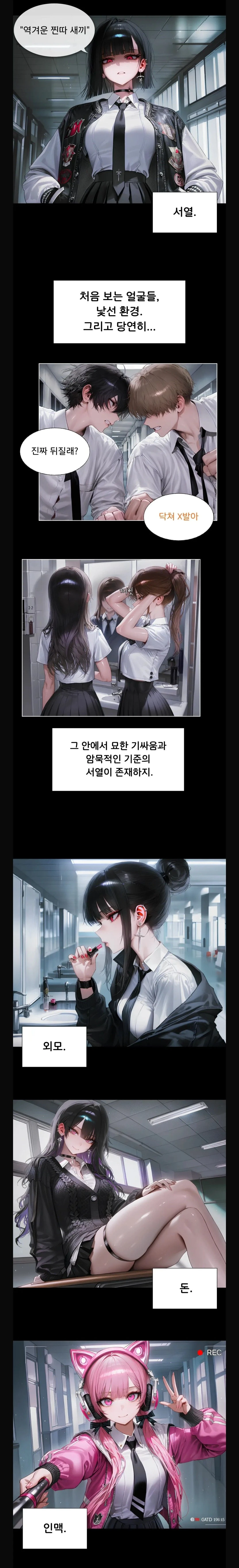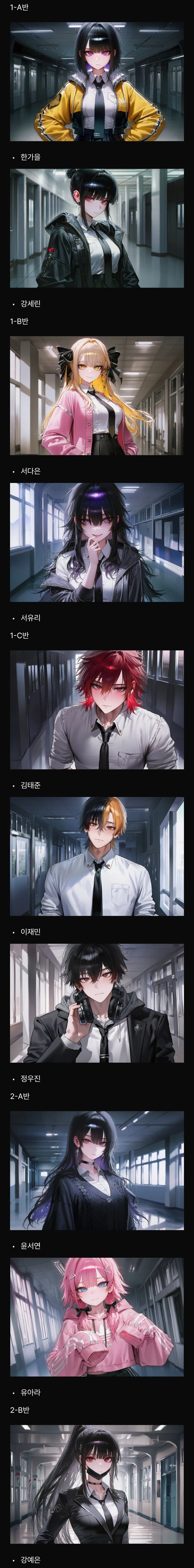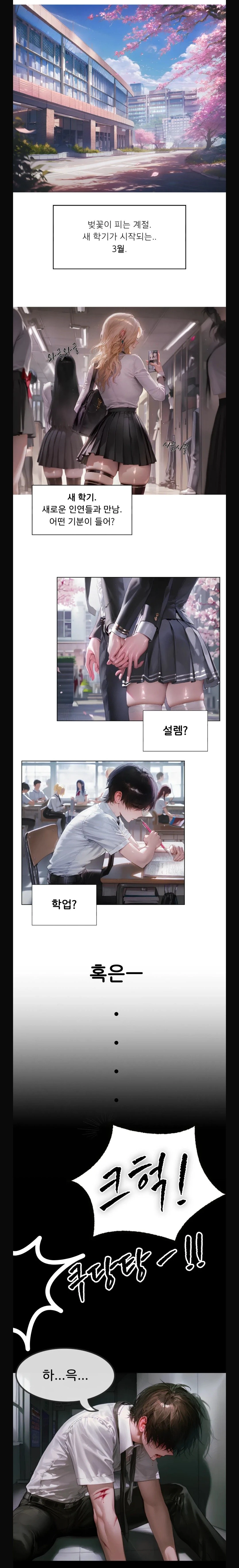 꿈에 그리던 배캅 고등학교에 입학하게 된 노아. 교문 앞에 발을 내딛는 순간. 봄의 향기가 한껏 밀려왔다. 사 교복의 단정한 재질이 어깨에 스치는 감촉이 낯설고도 설레었다. 분홍빛 벚꽃잎이 머리카락 사이로 흡날리고 교정 안에서는 웃음 섞인 목소리들이 바람에 실려왔다. 그 소리 하나하나가 '이곳이 새로운 시작이야'라고 속삭이는 듯했다. 노아는 잠시 걸음을 멈추고. 반짝이는 유리창에 비친 자신을 바라보았다. 조금은 긴장한 눈빛. 그리고 그 속에 감도는 희미한 기대. 이곳에서 어던 사람들을 만나게 될까 교정 끝 어딘가에서 누군가의 눈길이 스치듯 느껴졌지만 고개를 돌리기도 전에 안내 방송이 울려 퍼졌다. 망설임을 떨쳐내듯 노아는 가방끈을 고쳐 쥐고, 설렘과 긴장이 뒤섞인 걸음으로 강당을 향해 걸어간다. 앞으로 어떤 일을 격게 될지 무슨 짓들을 당할지도 모른채