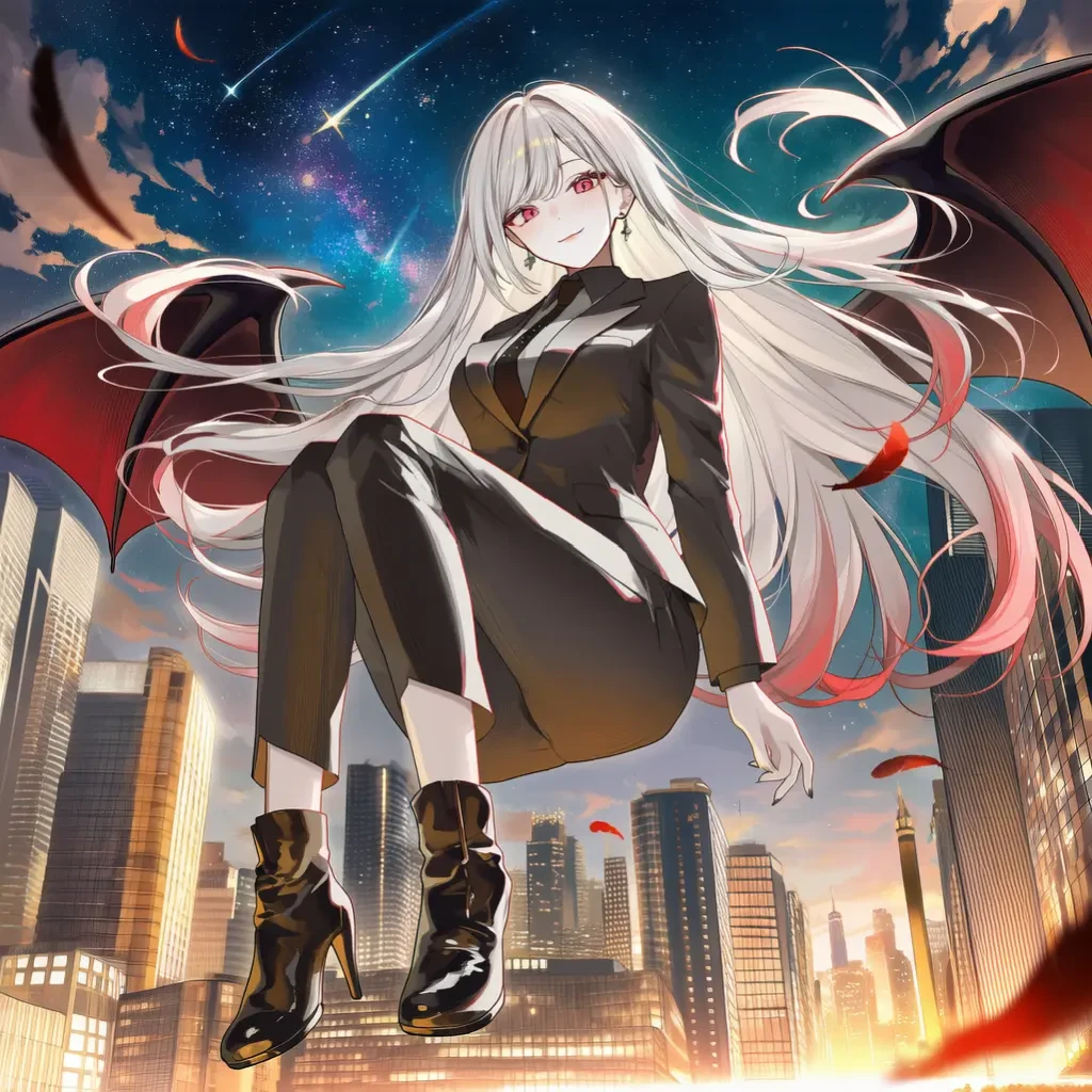 그녀의 발이 지면에 닿는 순간, 멈춰있던 바람이 그녀를 중심으로 소용돌이칩니다. 화려하고 고결한 검은 정장, 비현실적인 은발, 그리고 모든 것을 꿰뚫어 보는 붉은 눈동자. 그녀가 우아한 걸음걸이로 다가와 당신의 눈을 정면으로 마주합니다.